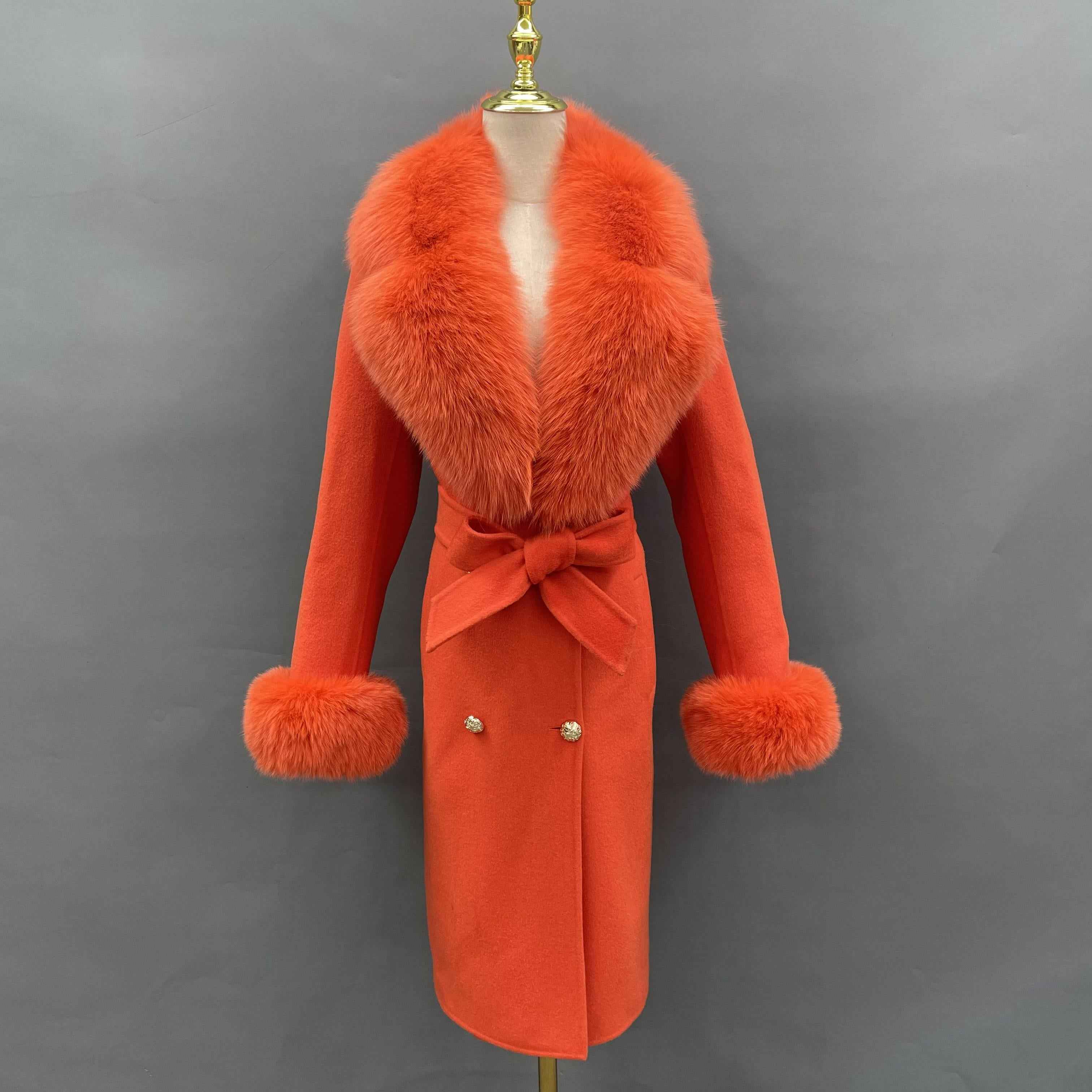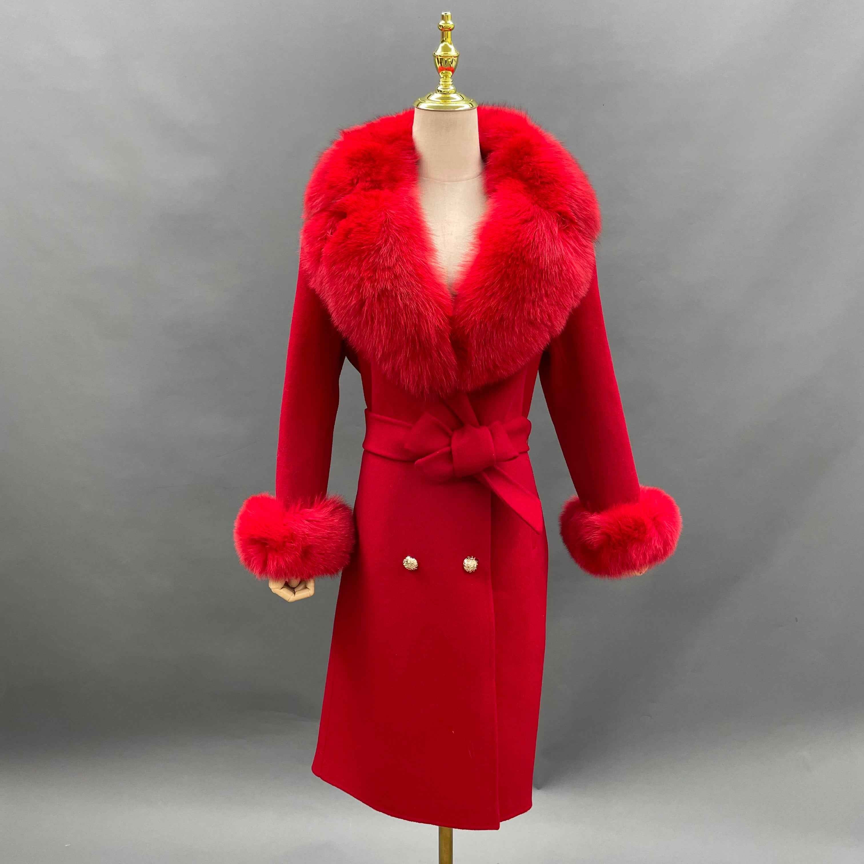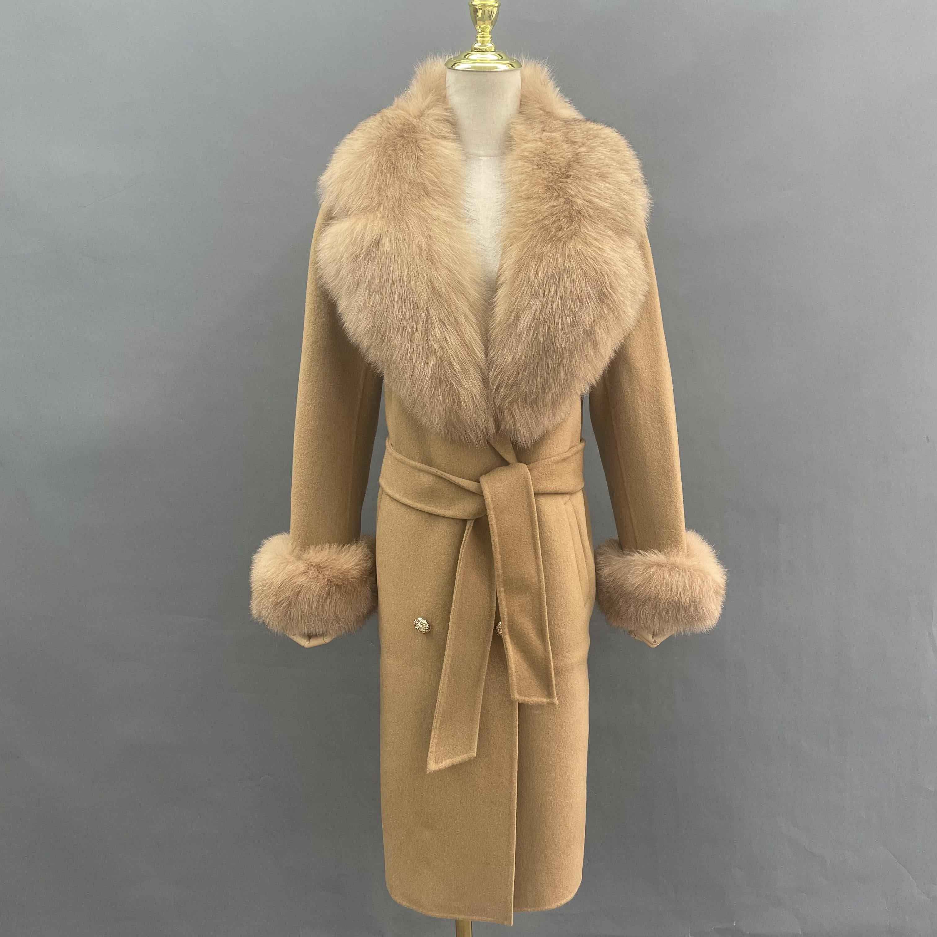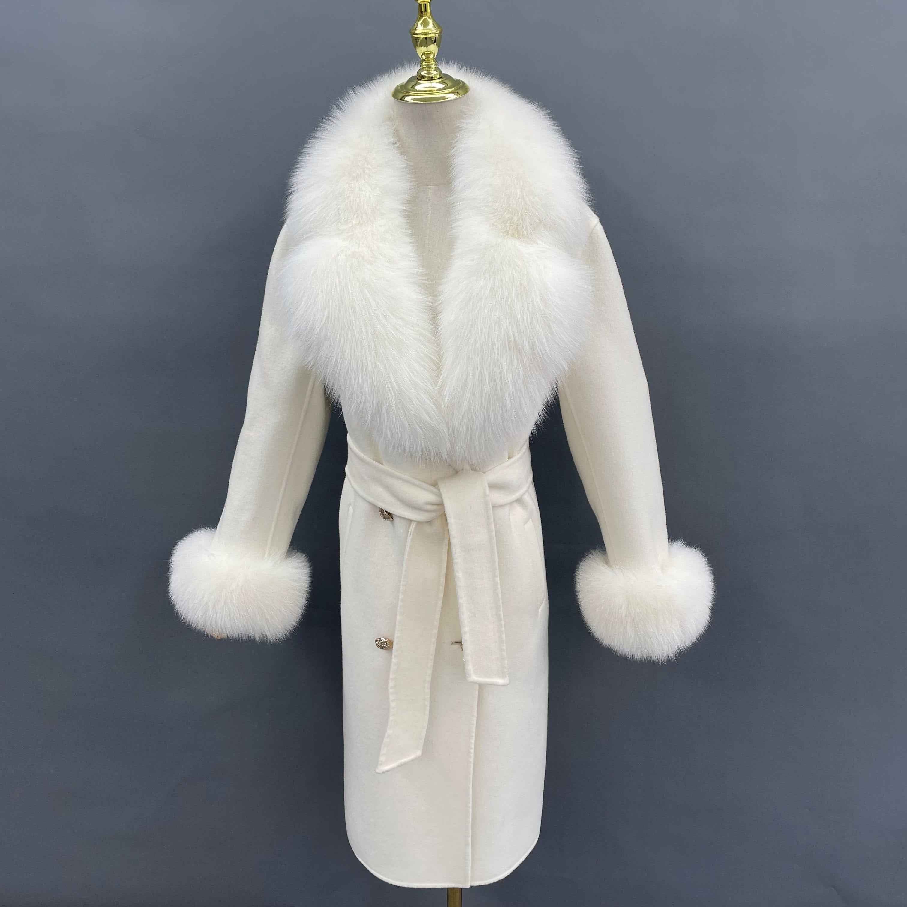 Double - Faced Wool Coat with Fox Fur Collar, Cuffs and Tie Waist