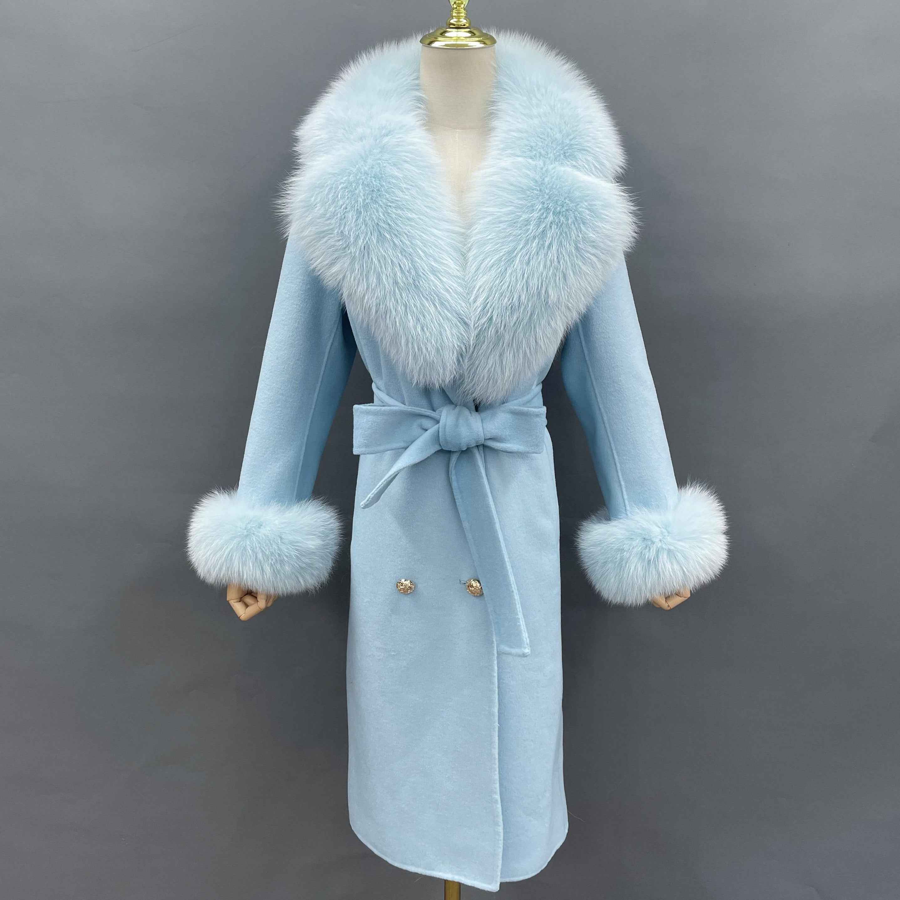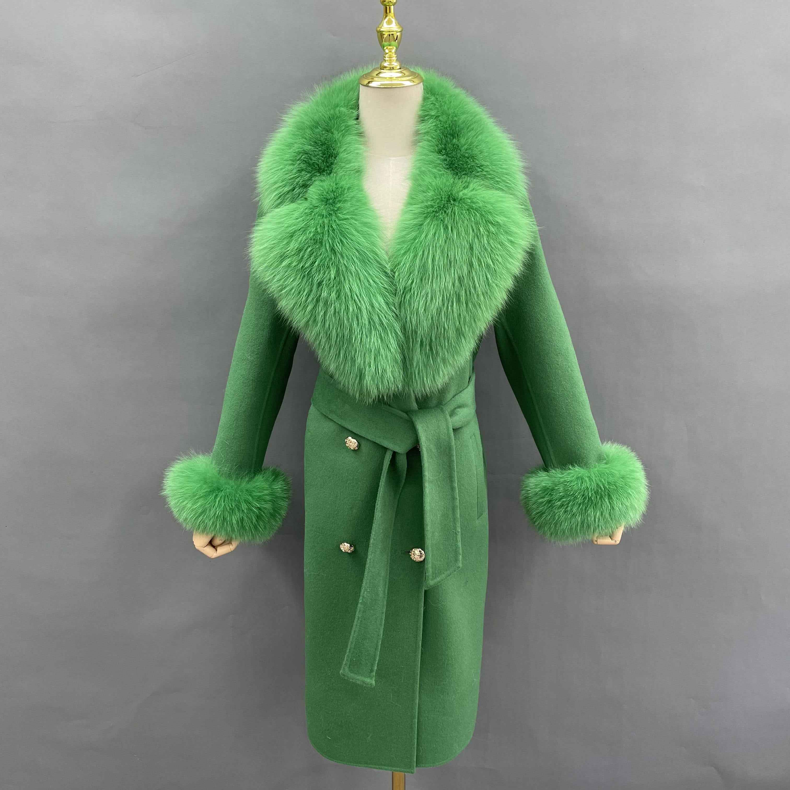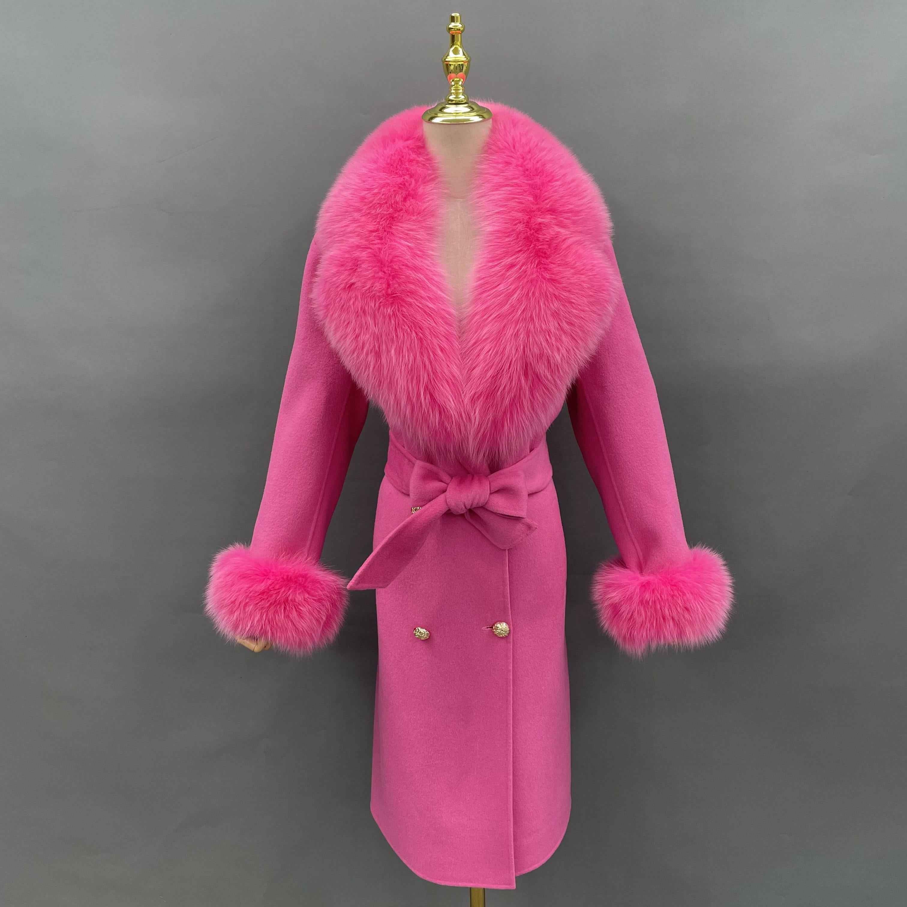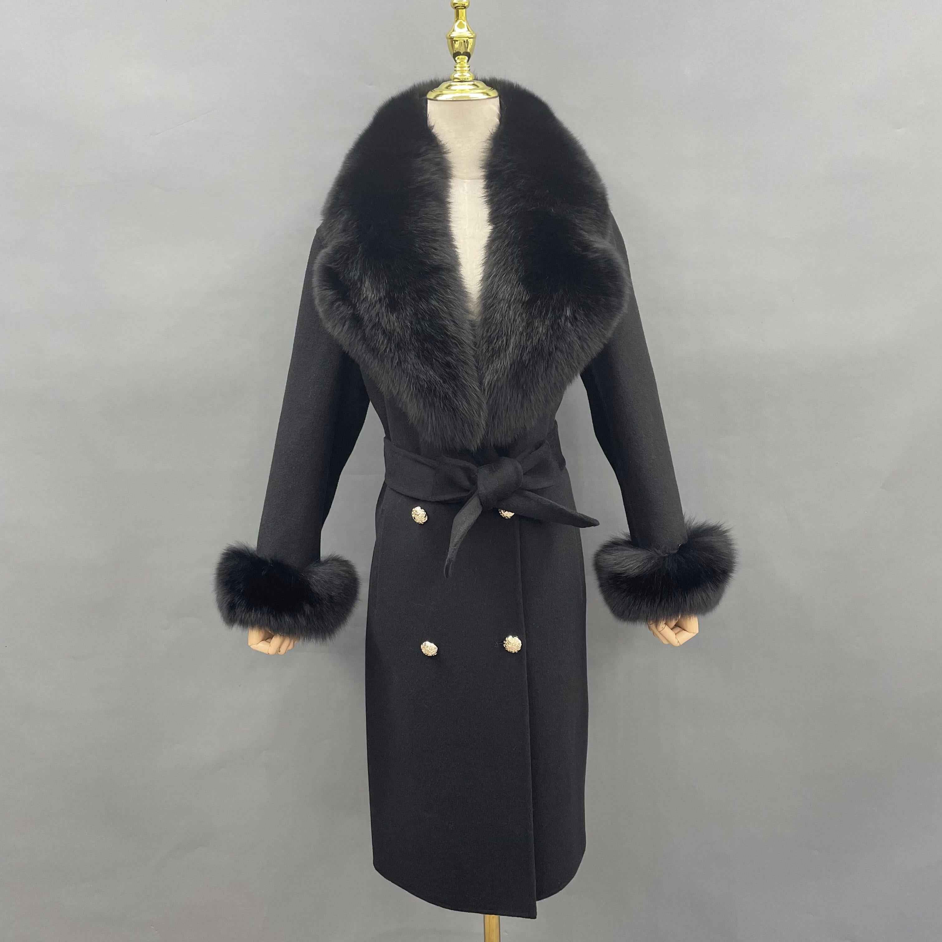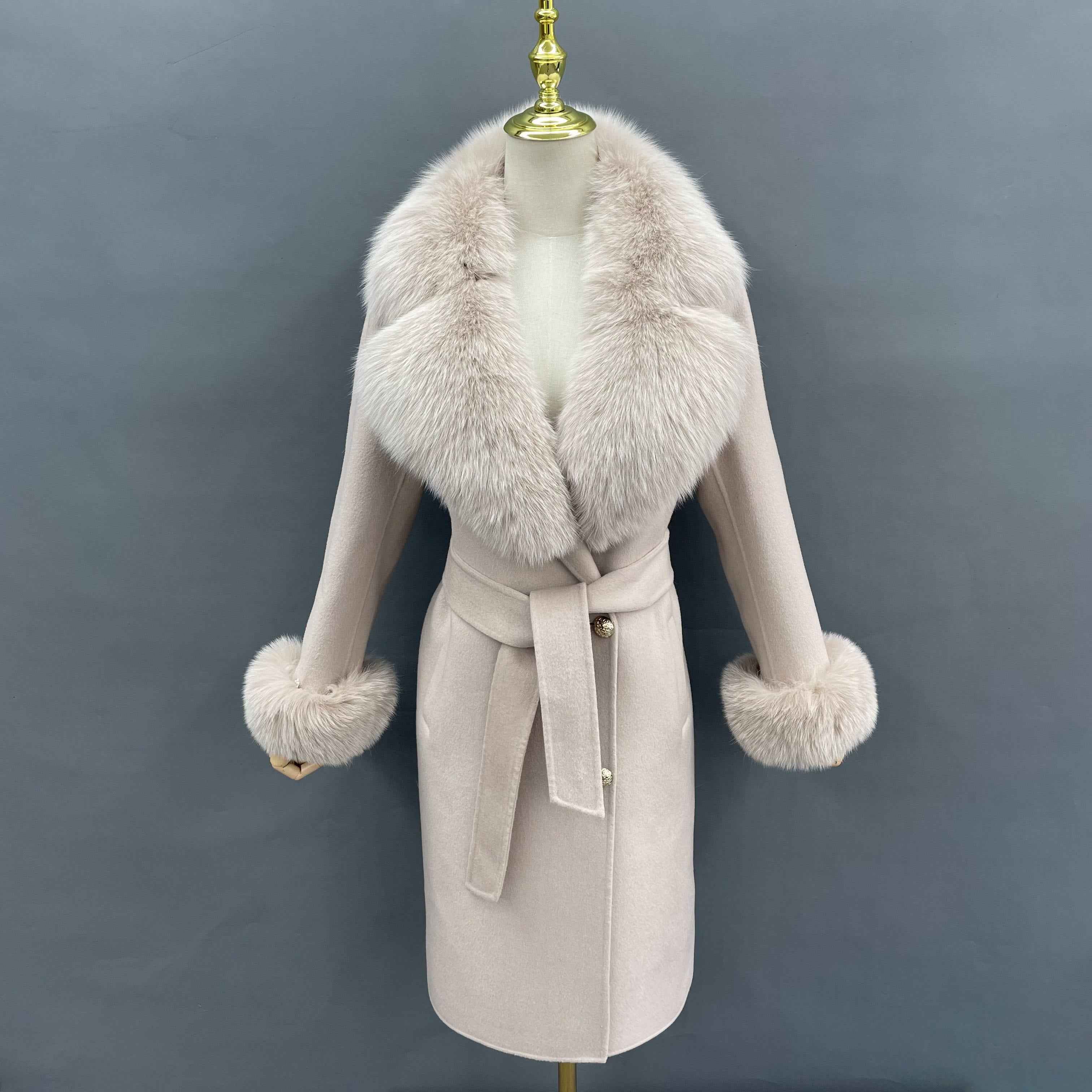 Double - Faced Wool Coat with Fox Fur Collar, Cuffs and Tie Waist