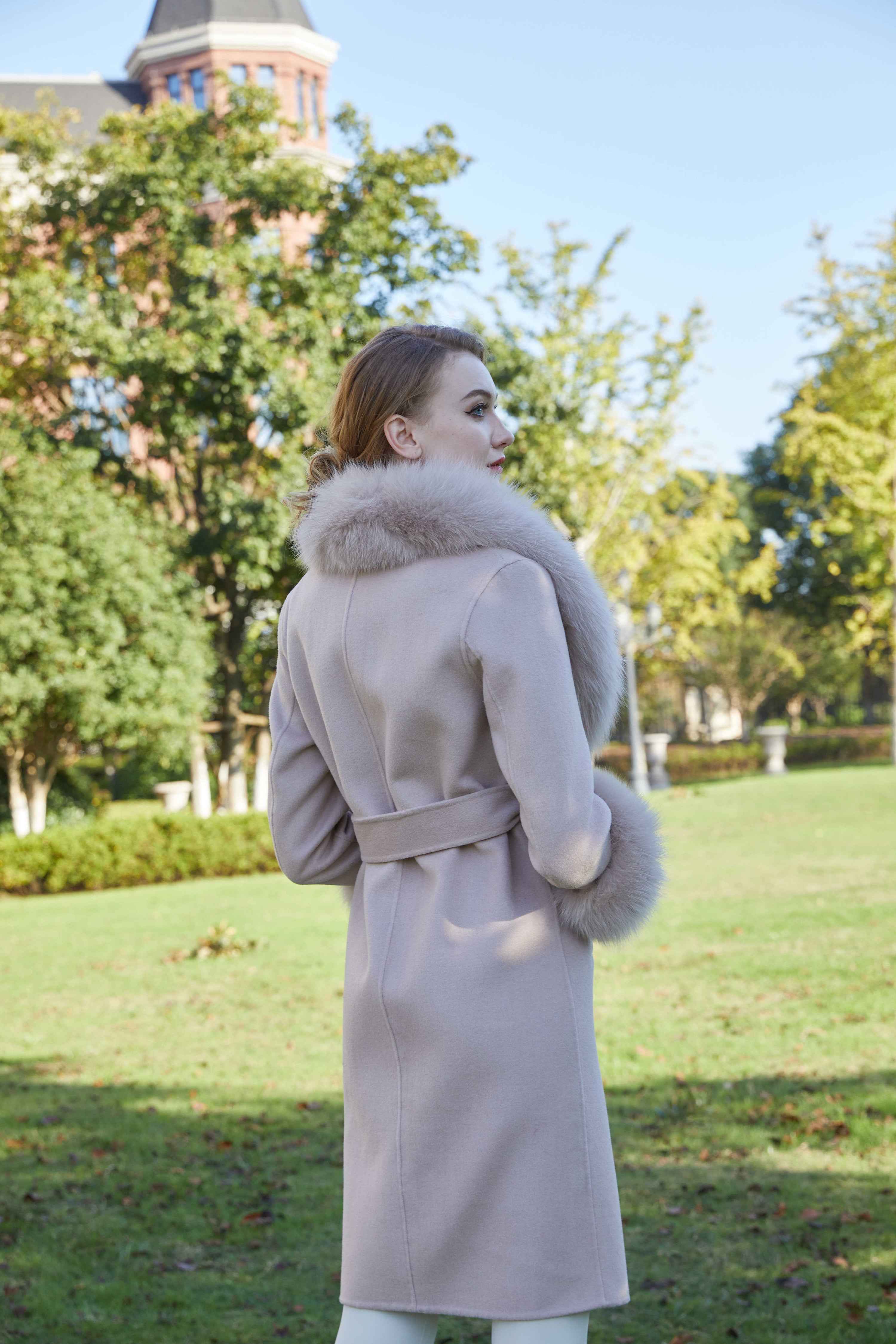 Luxurious Double - Faced Wool Long Coat with Large Fox Fur Collar, Fur Cuffs and Tie Waist