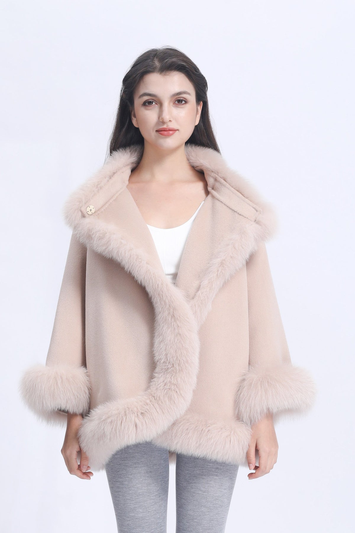 Women's White Fox Fur Cape – Luxurious Double-Faced Wool Cloak with Fur Trim, Elegant Winter Outerwear for Women
