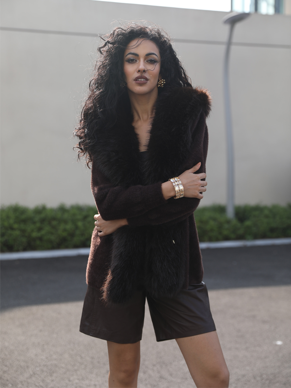 Women's Fox Pile Knit Coat with Faux Mink Placket and Faux Fur Collar