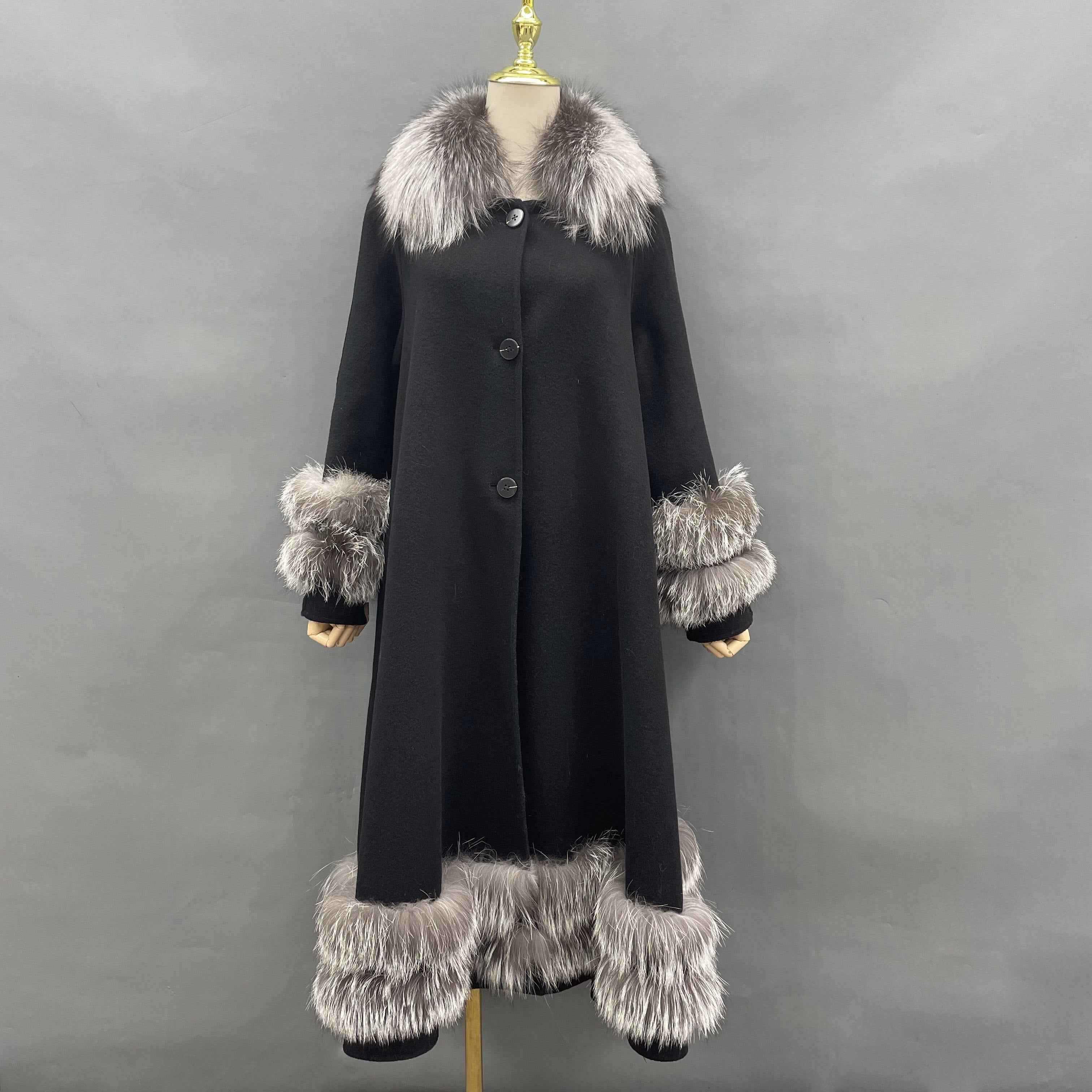 Double - Faced Wool Coat with Double - Layer Fox Fur Trim on Cuffs, Hem & Collar - Luxury Warm Fashion Winter Outerwear