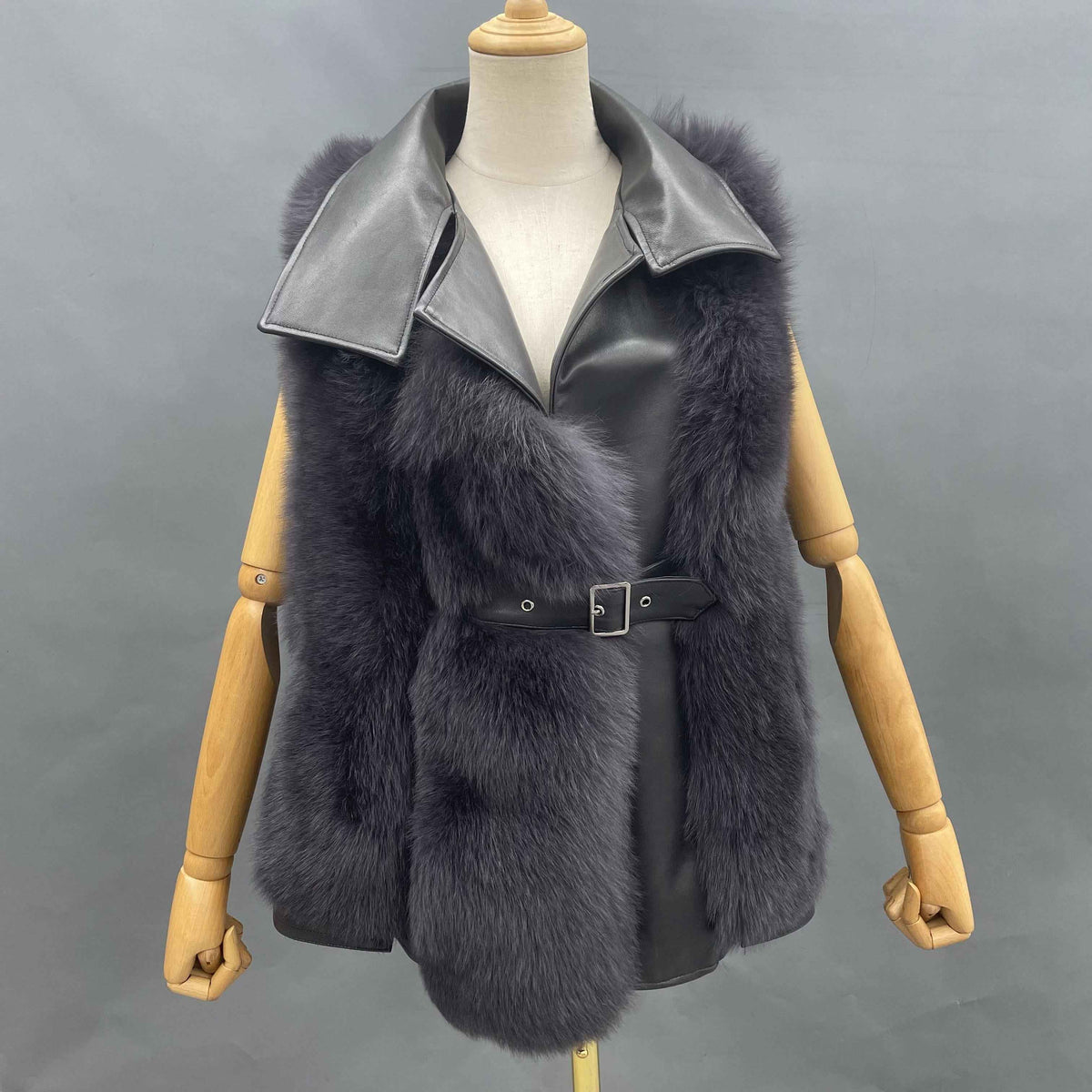 Women's Luxury Fox Fur Vest with Leather Buckle - Vertical Panel Design & Leather Hem Edgy Outerwear