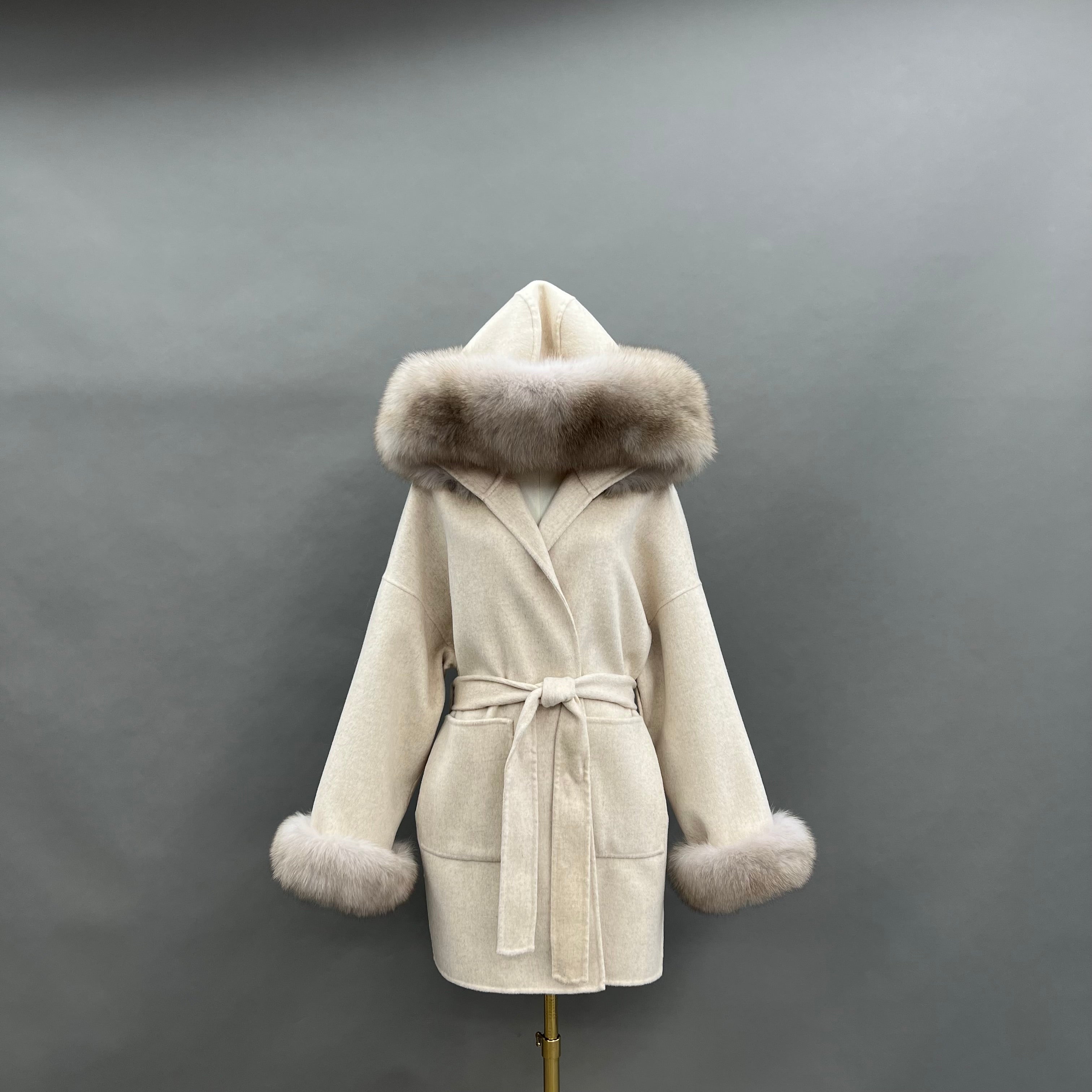 Double - Faced Wool Hooded Coat with Faux Fur Trim on Hood and Cuffs & Tie Waist