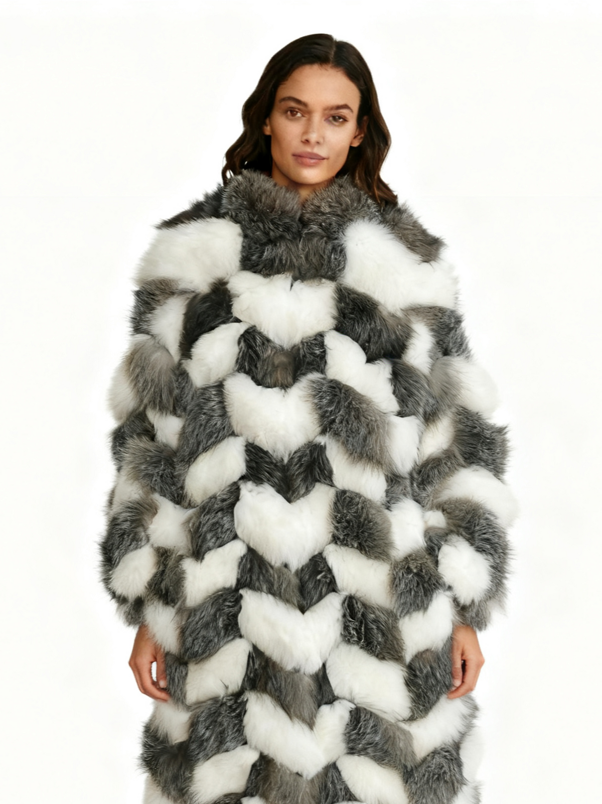 Geometric Fox Fur Checkered Coat - High-End Color Block Winter Fashion