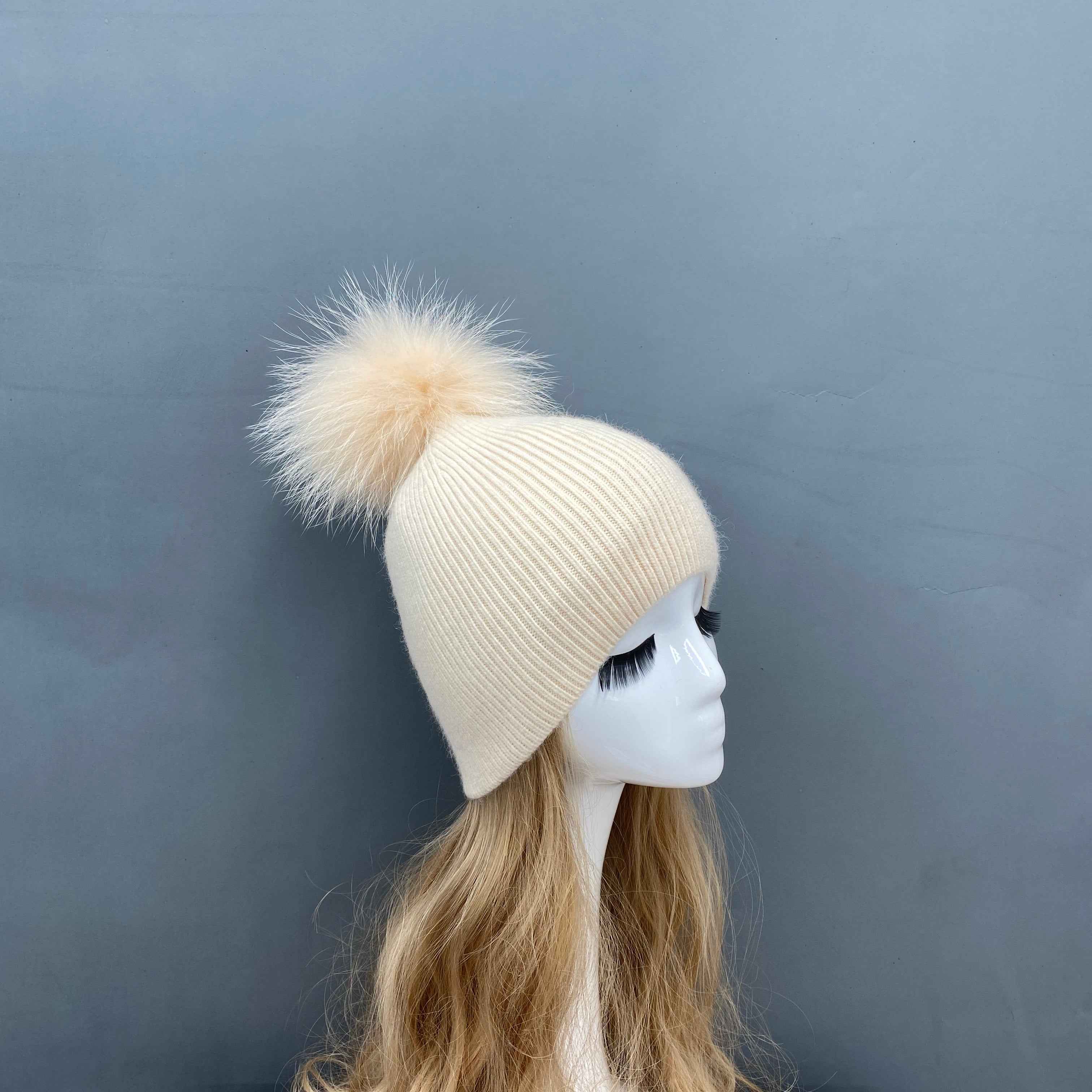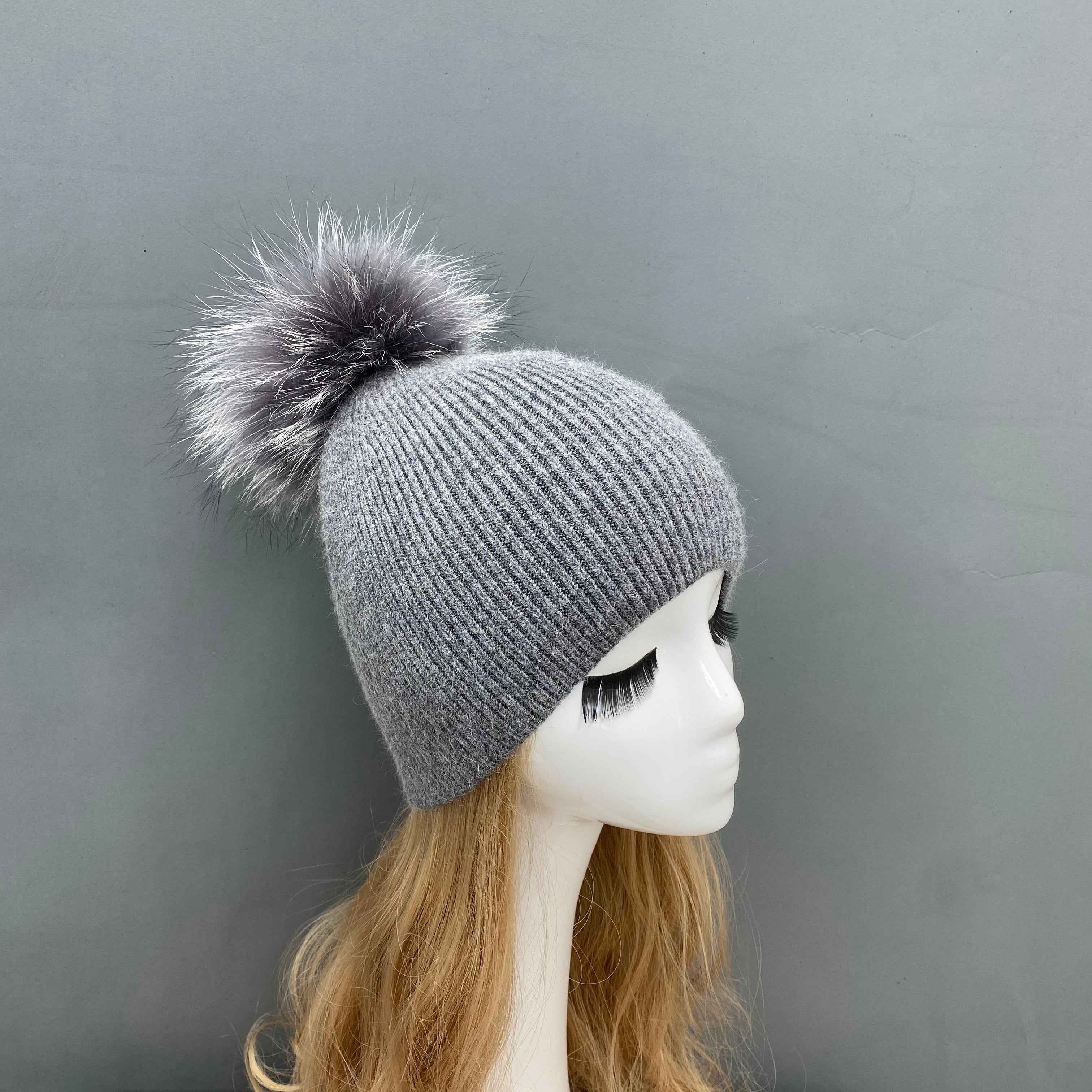 Women's & Kids' Gray Knit Beanie with Real Raccoon Fur Pom-Pom – Soft Rabbit Blend, Non-Cuffed Winter Hat for Family