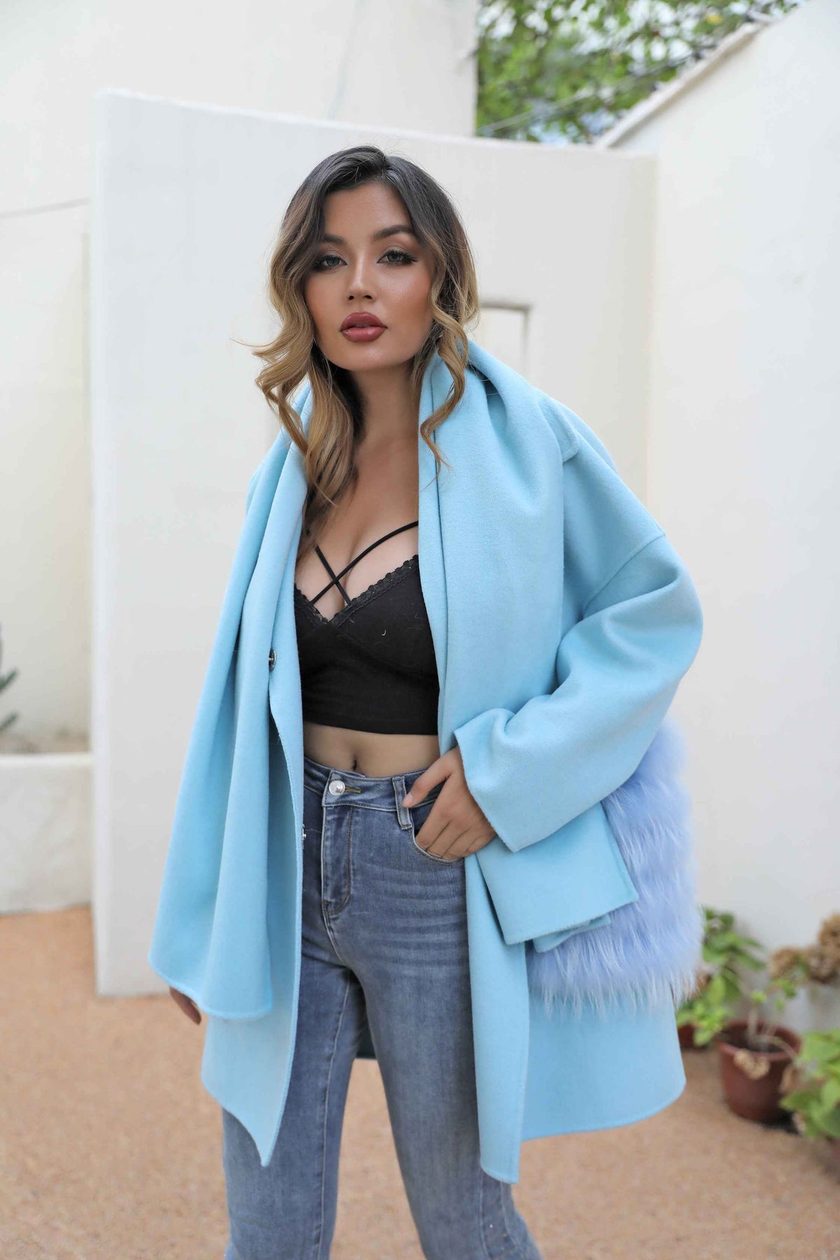 Women's Luxury Double - Faced Wool Coat with Integrated Scarf & Fox Fur Pockets, Relaxed Fit Elegant Winter Outerwear