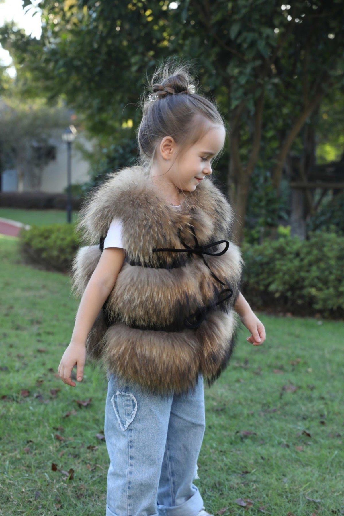 Gilet in pelliccia di procione a tre sezioni per bambini, autunno e inverno