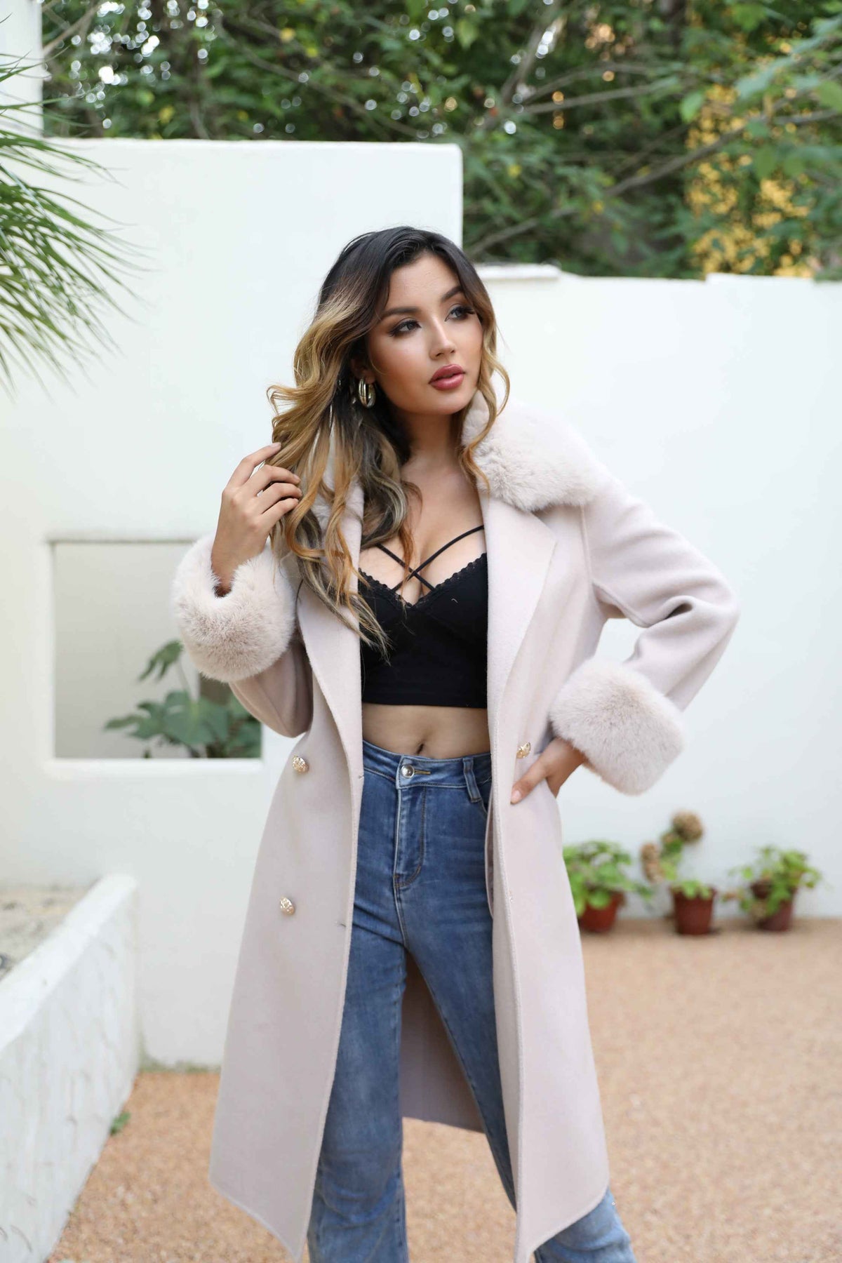 Elegant Double - Faced Wool Long Coat with Faux Fur Collar, Faux Fur Cuffs and Double - Breasted Design