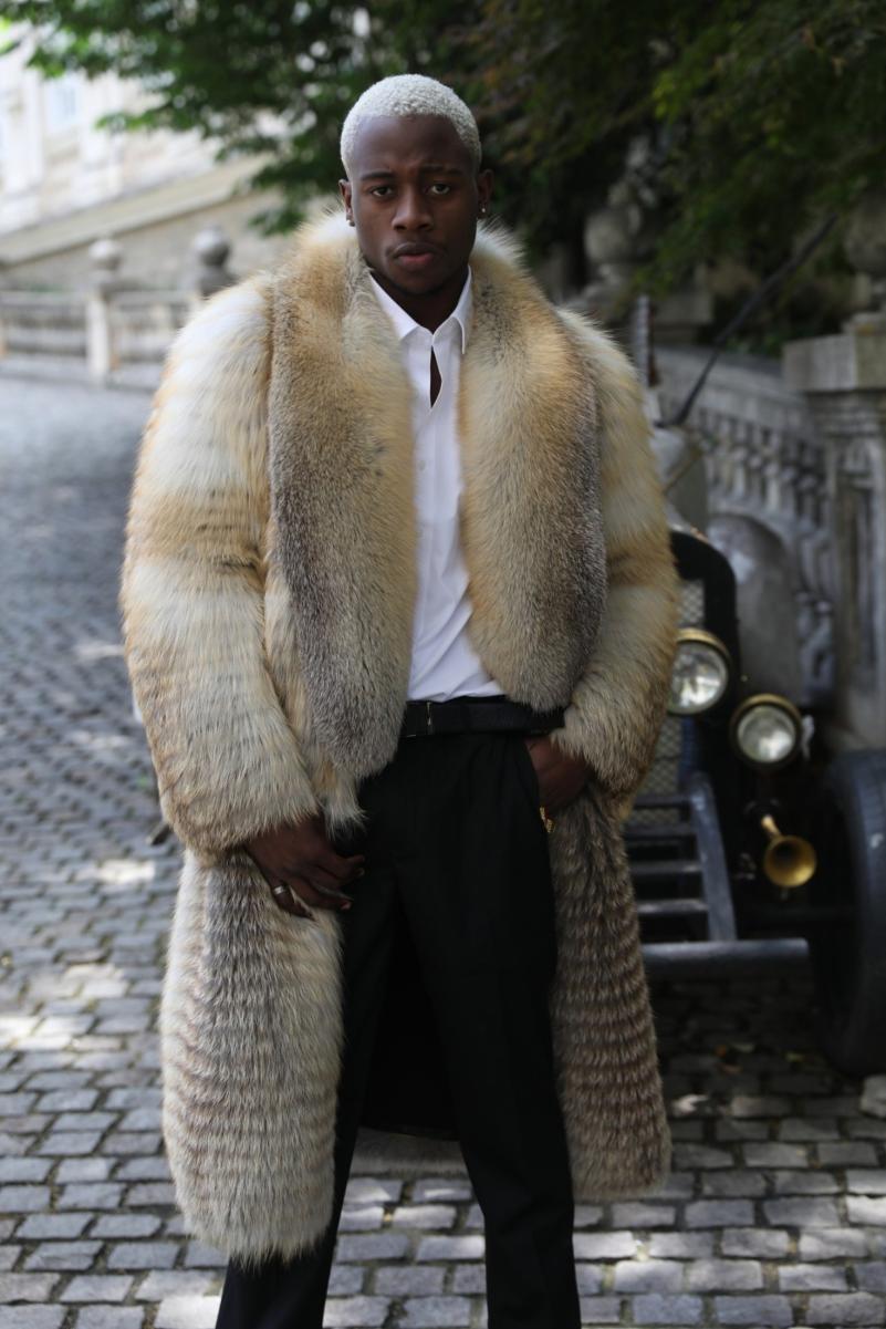 Cappotto lungo in pelliccia di volpe con ampio collo e strisce decorative
