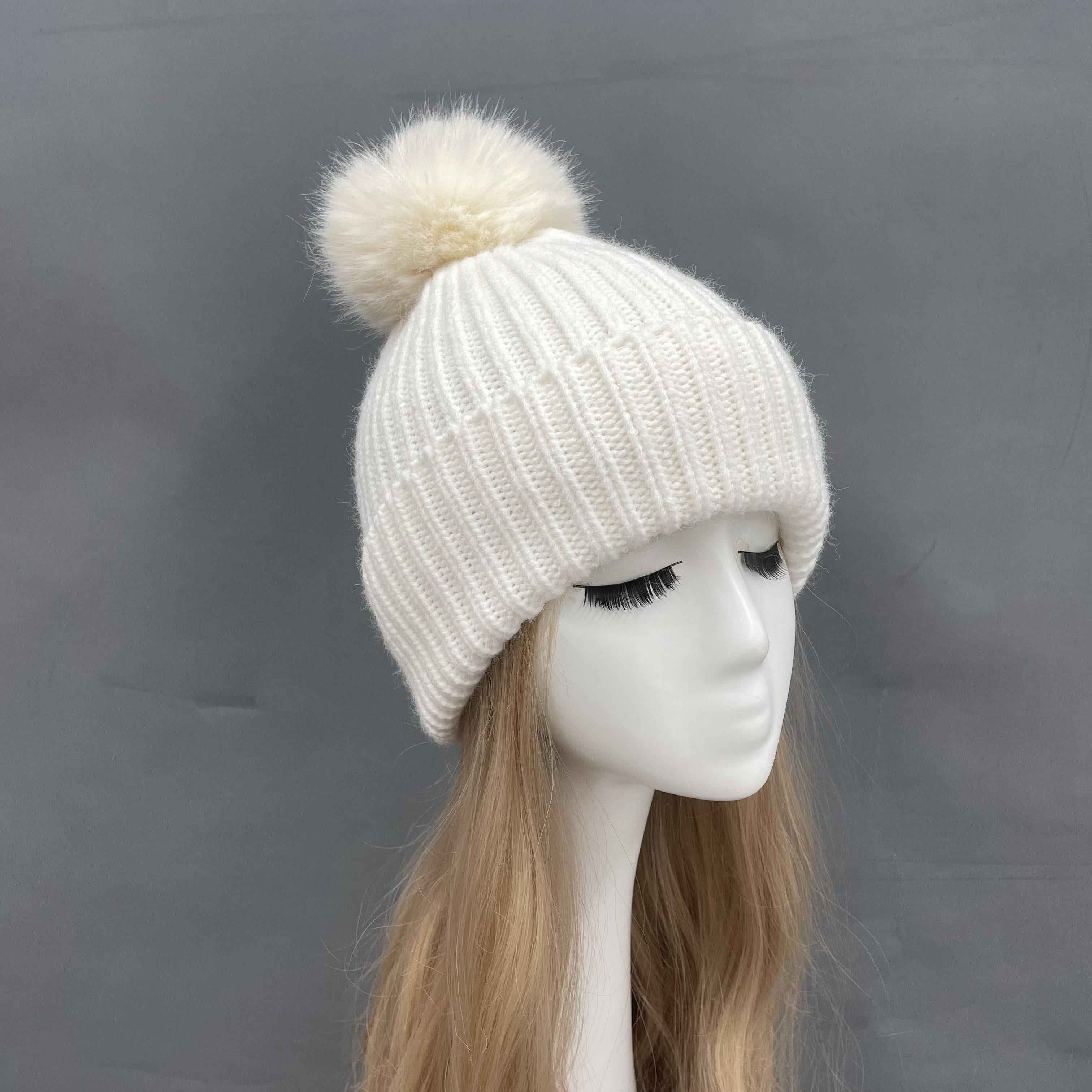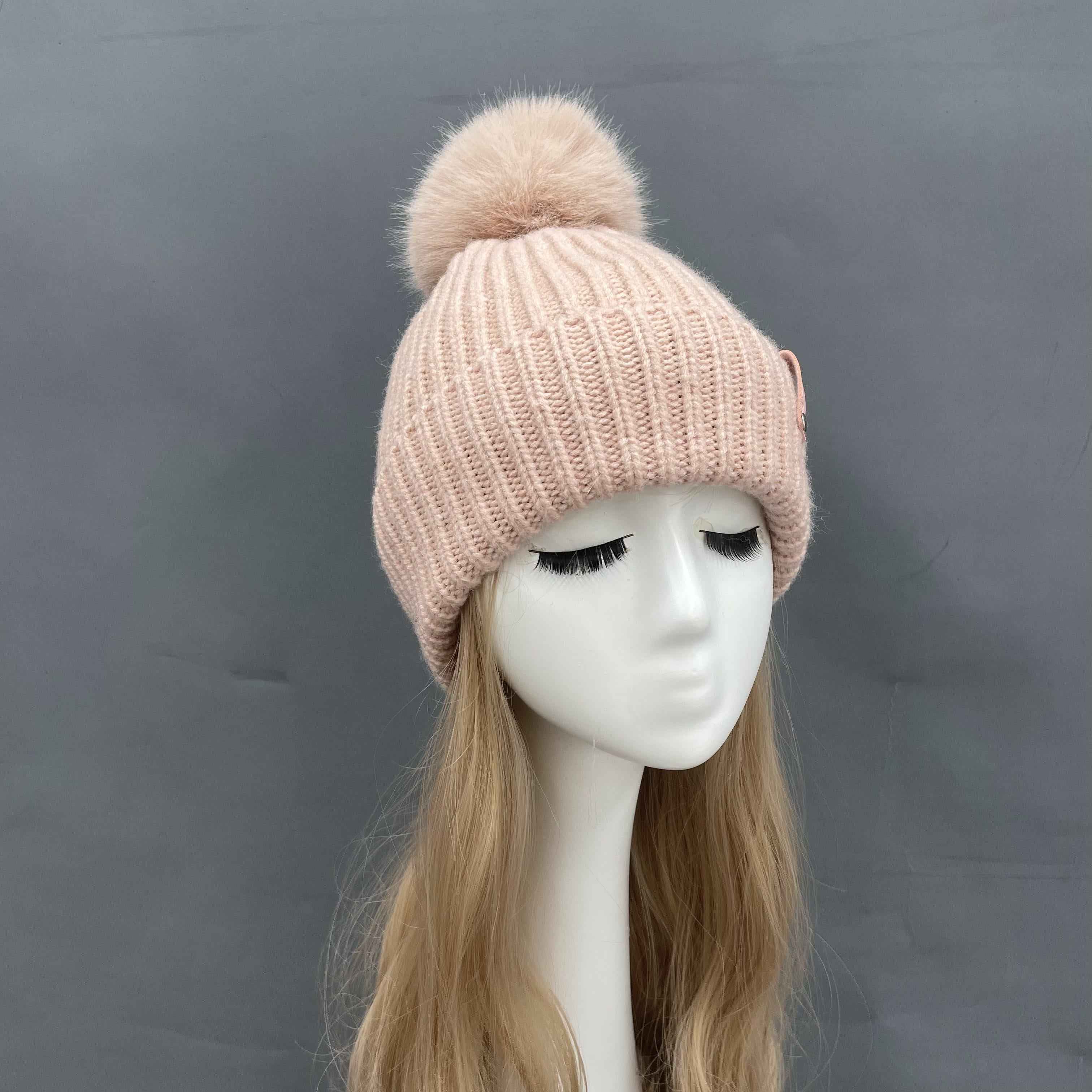 Women's Orange Knit Beanie Hat with Fur Pom-Pom & Leather Patch – Warm Winter Hat for Women, Fashionable & Cozy