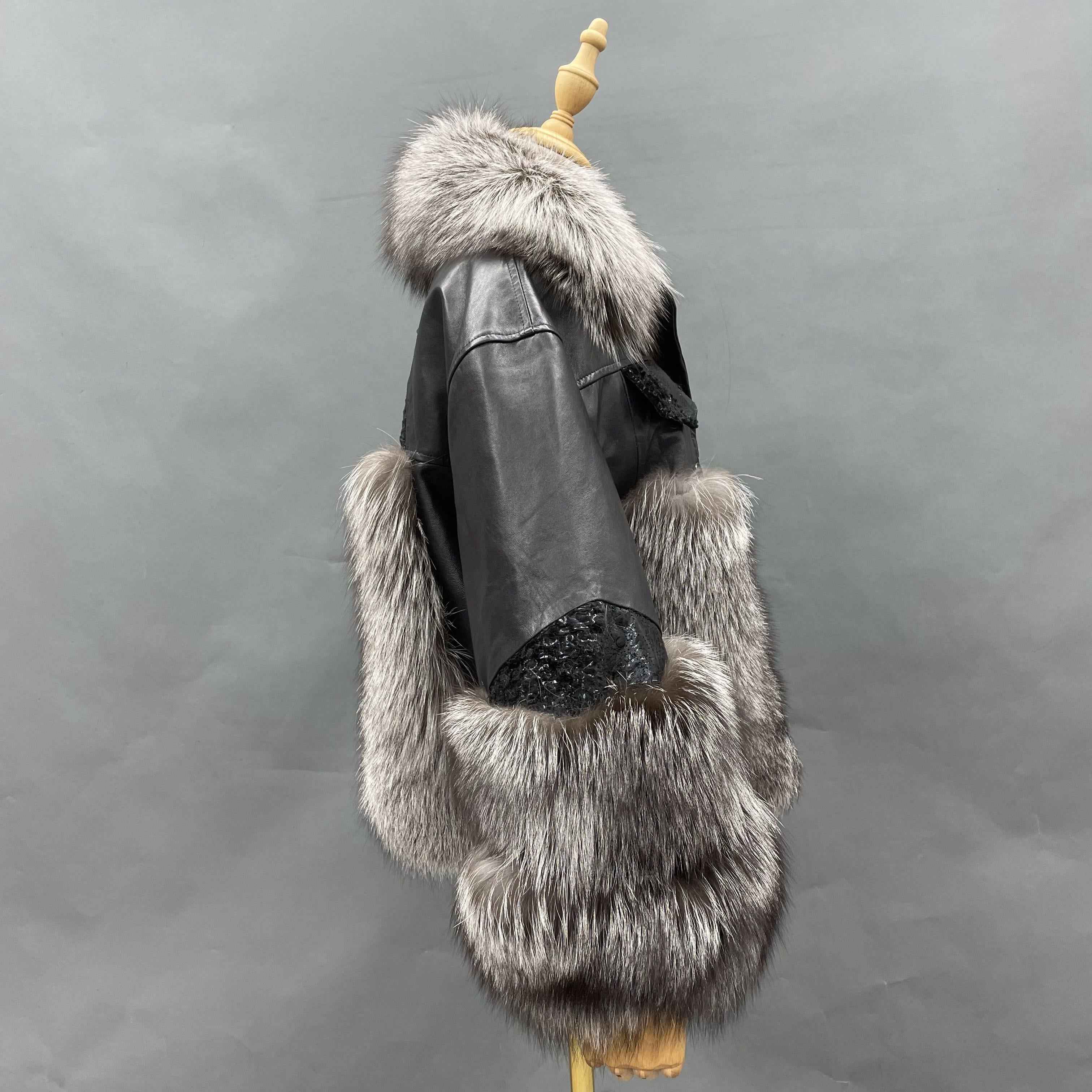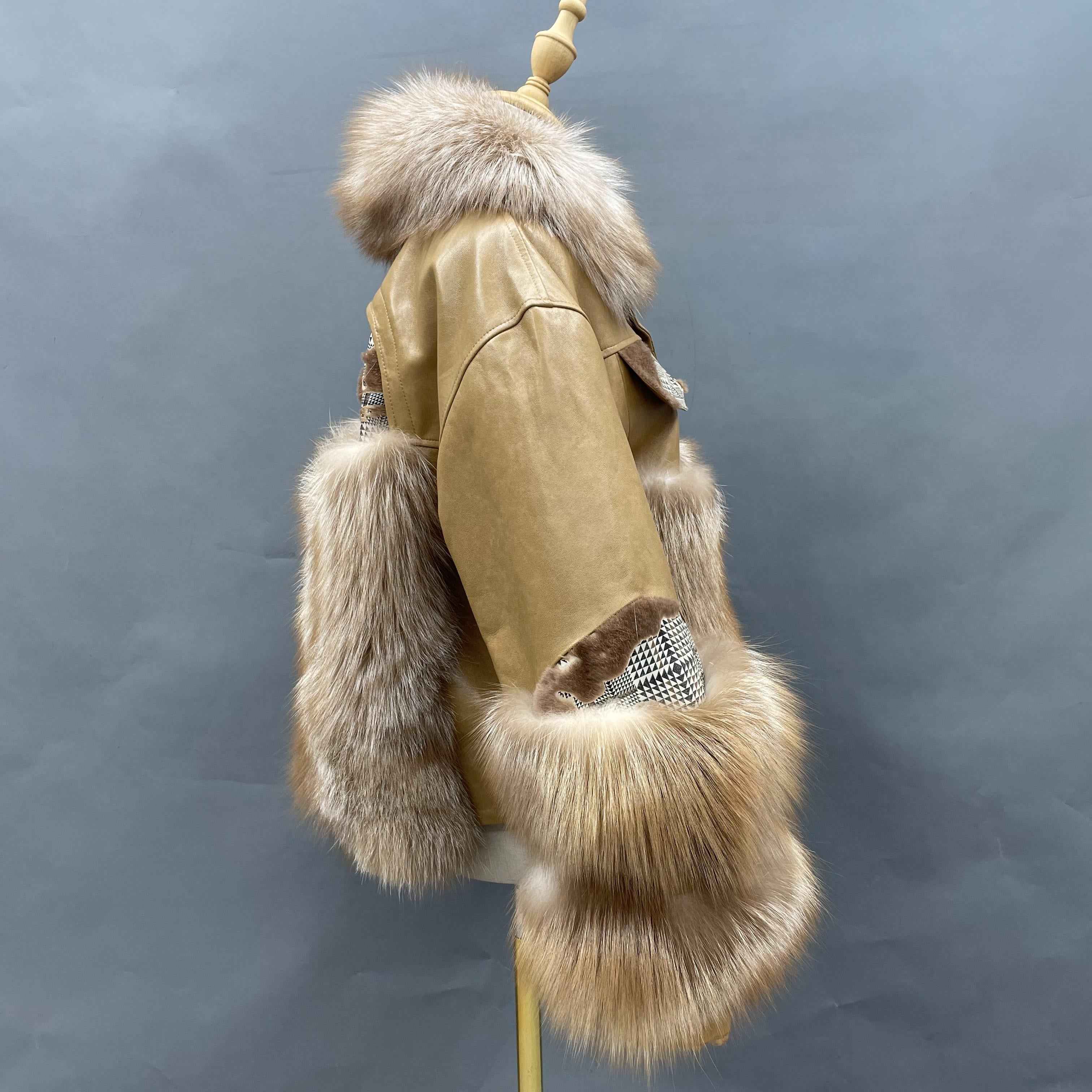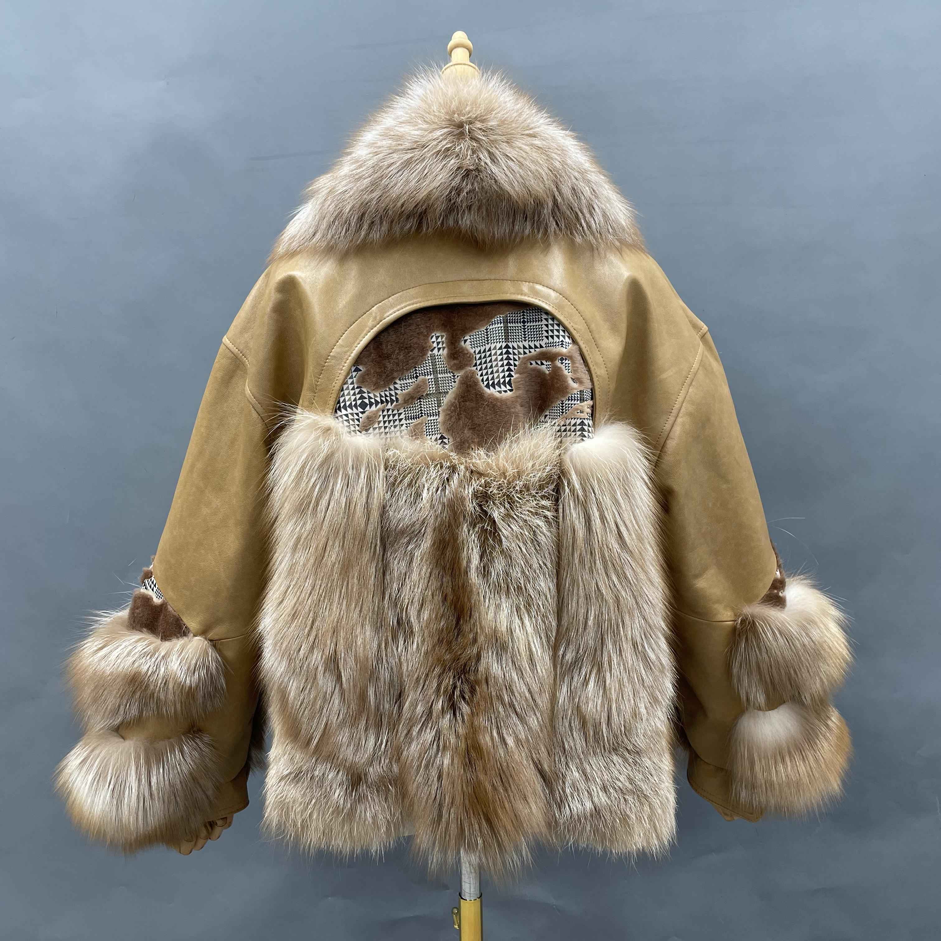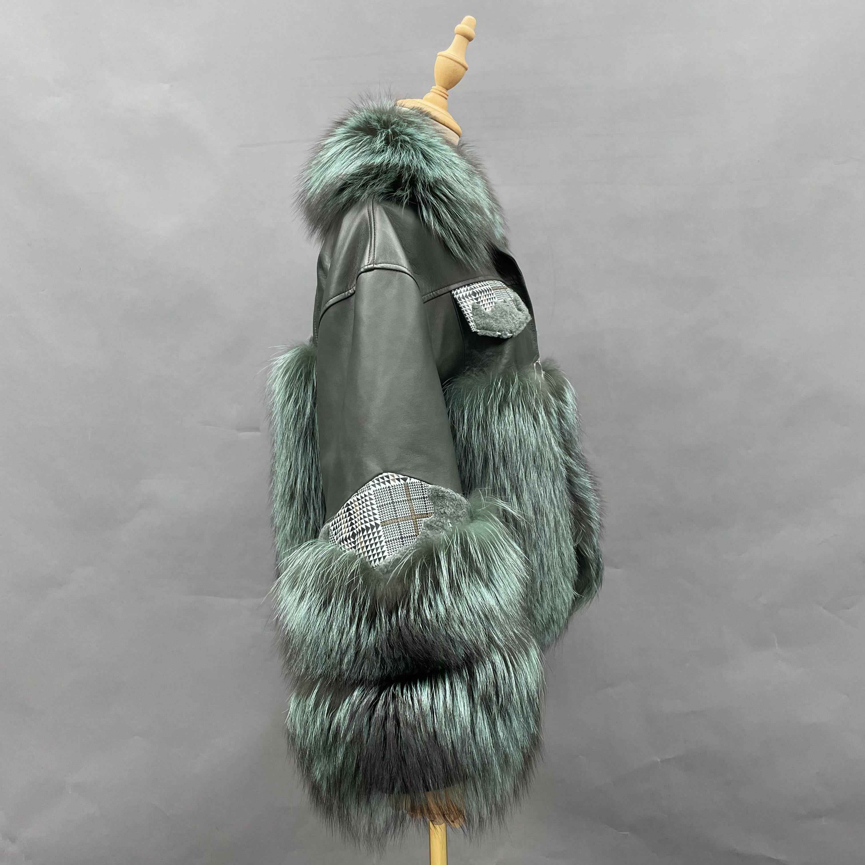 Women's Luxury Teal Fox Fur & Leather Patchwork Jacket - Plaid Detail Button Closure Cropped Winter Fashion Outerwear