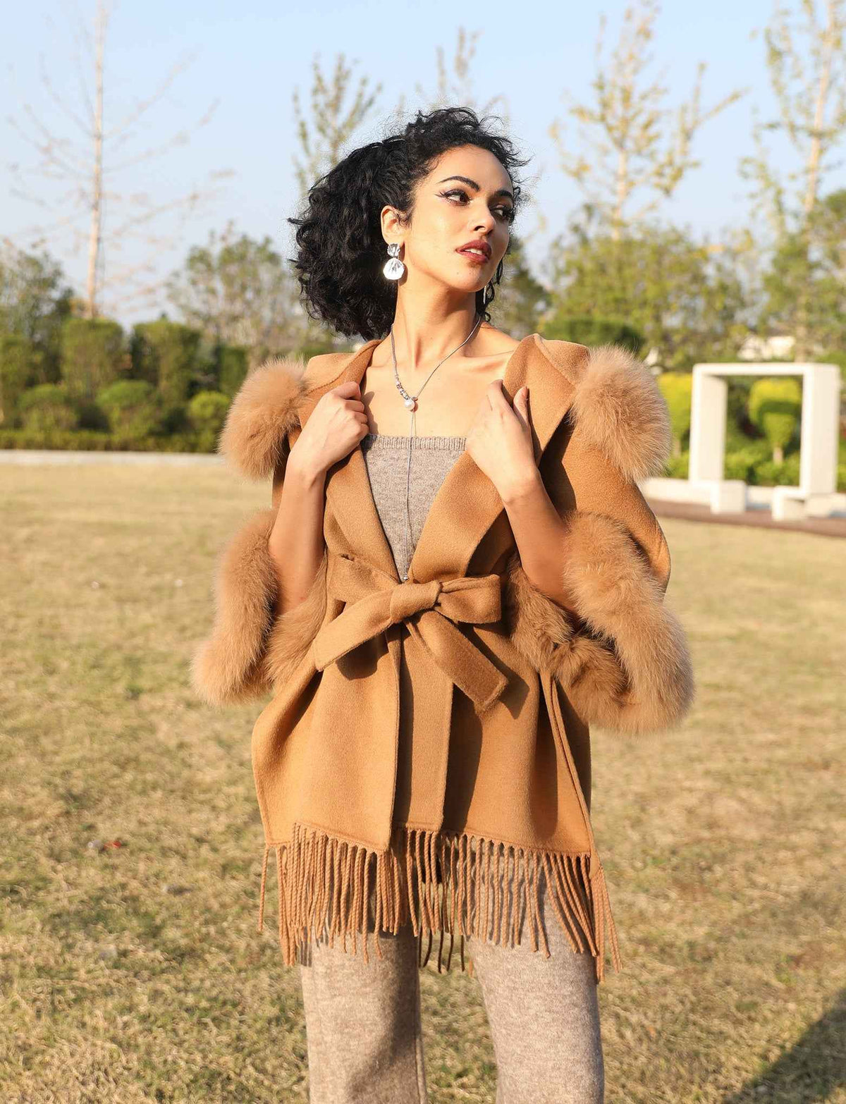 Hooded Double - Faced Wool Cape Coat with Fox Fur Trim and Fringe Hem