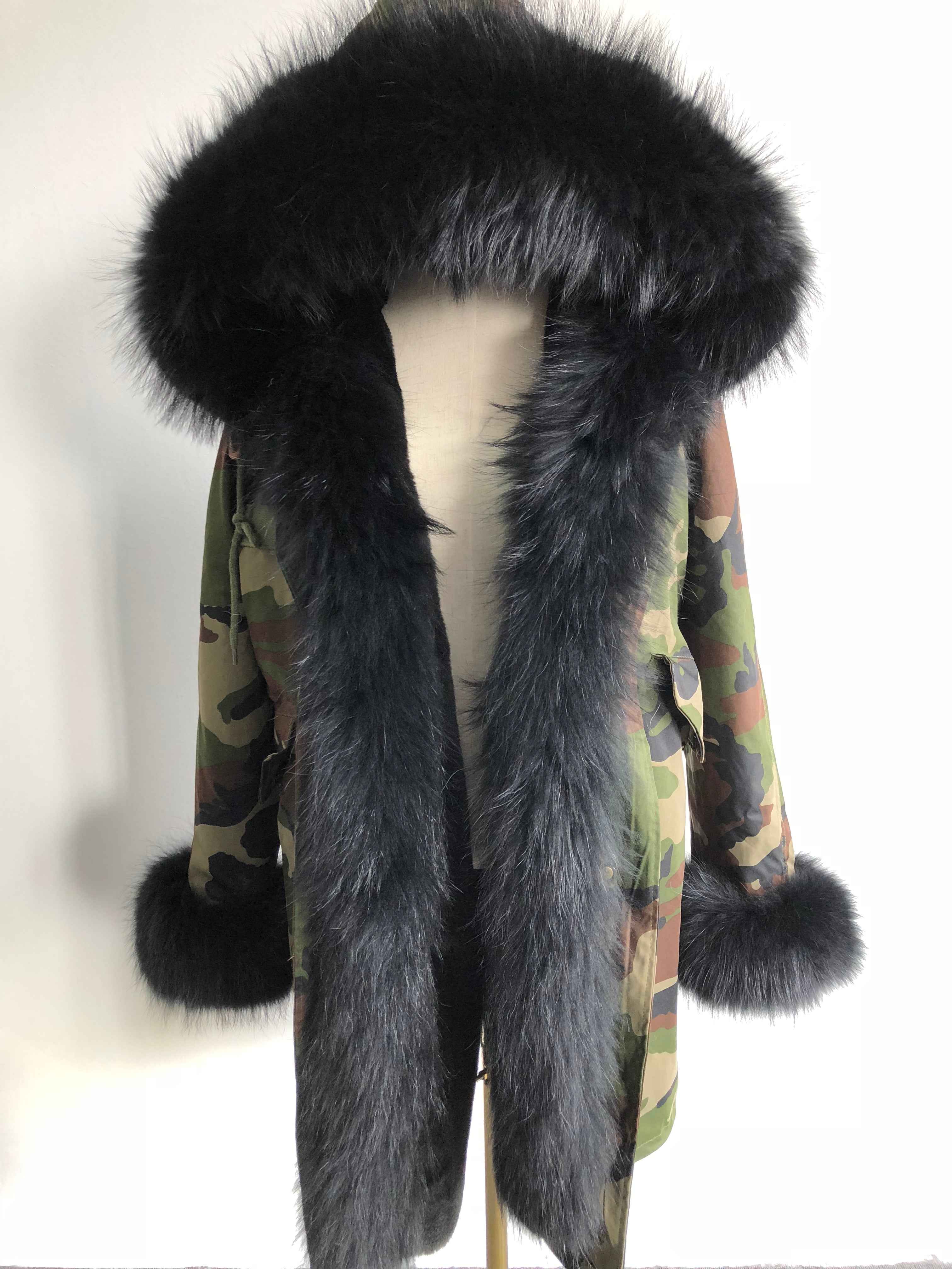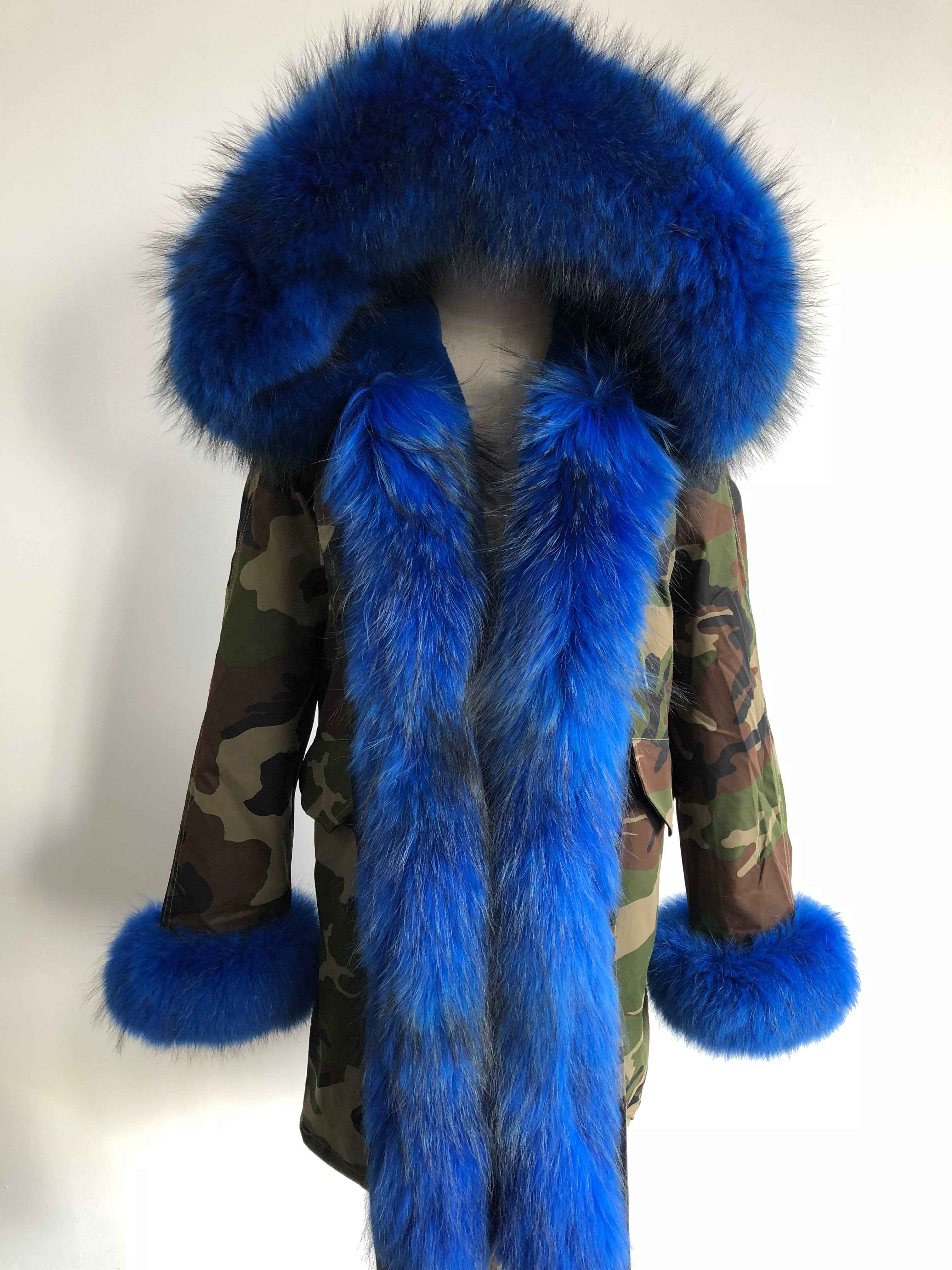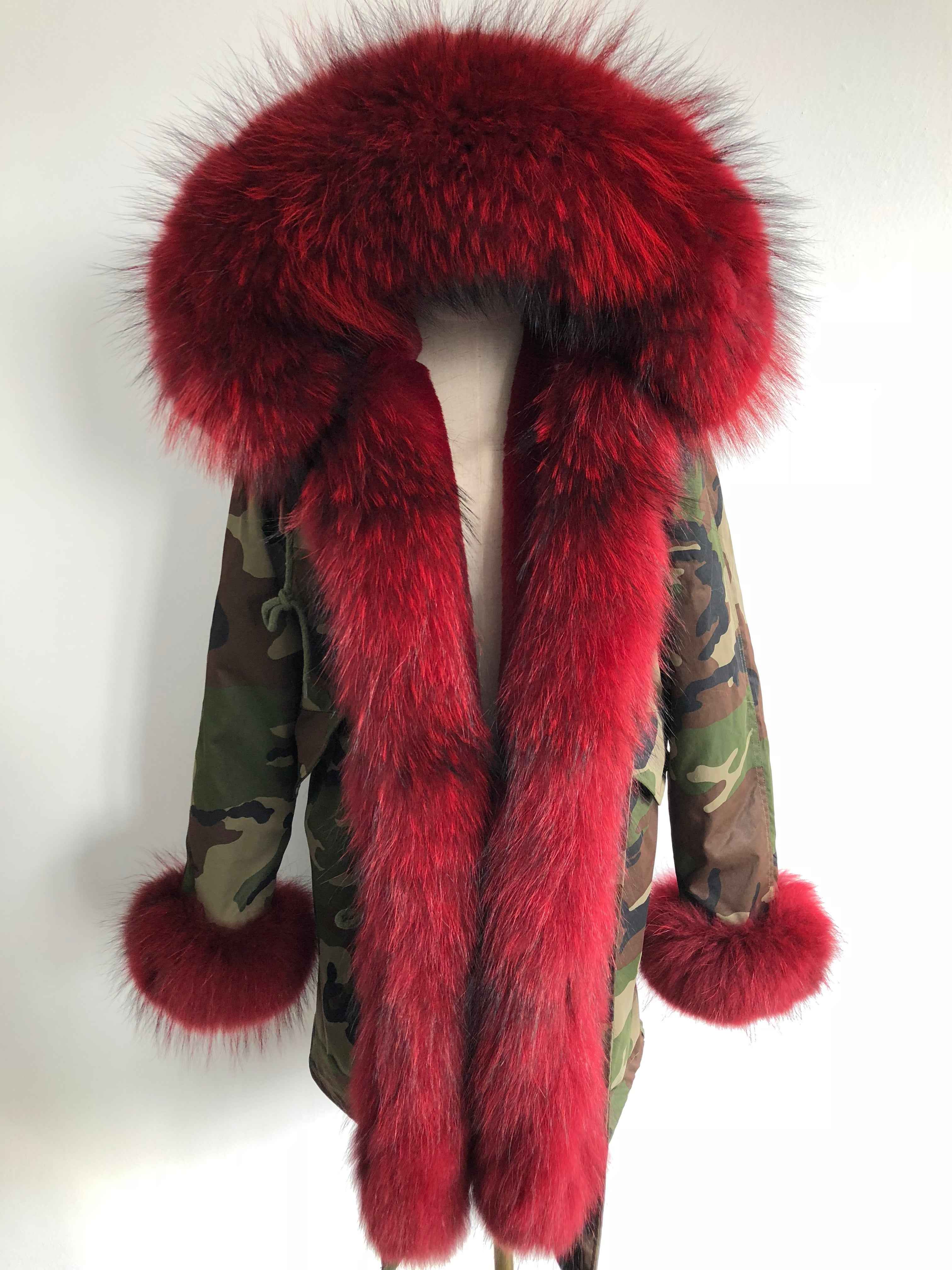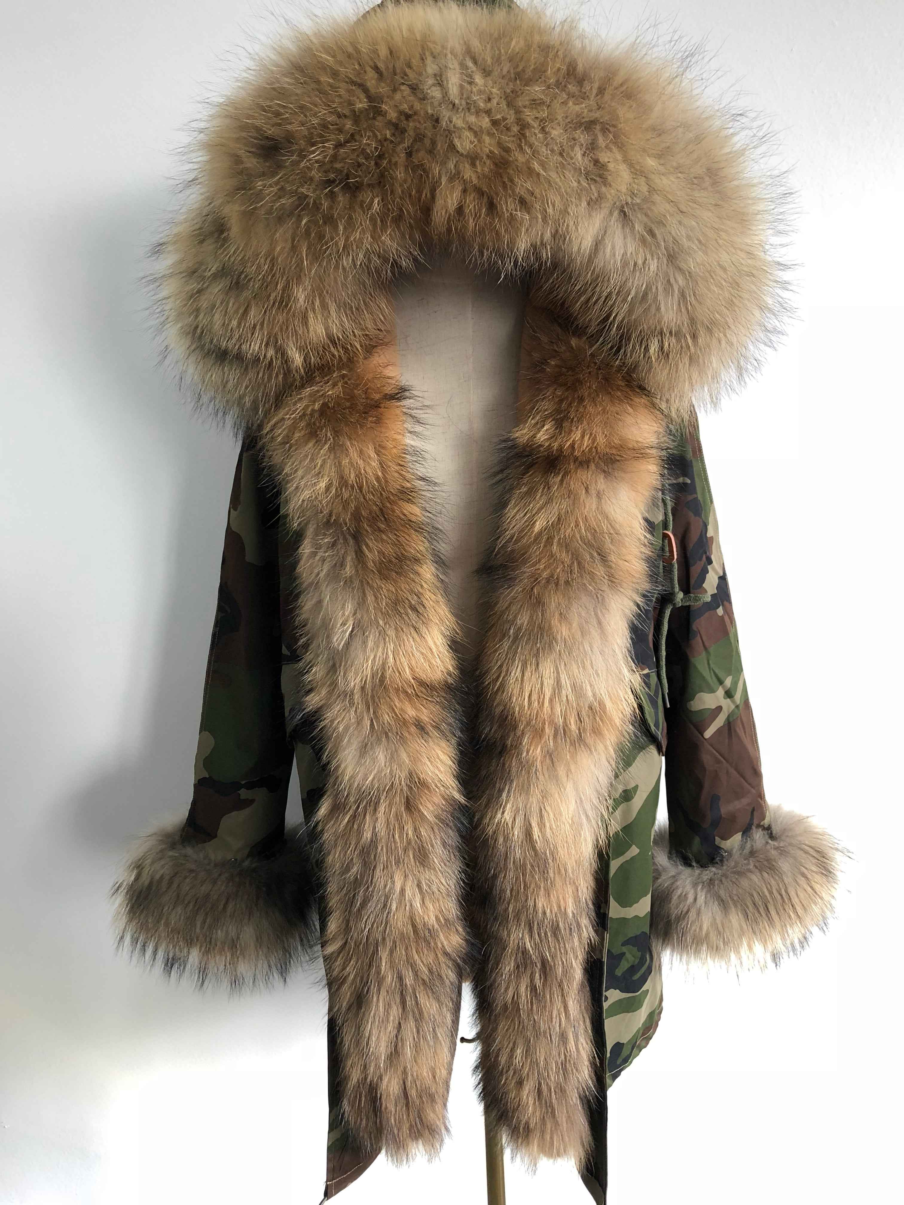 Long Camouflage Parka with Raccoon Fur Trim – Hooded Winter Coat for Women, Full-Length Raccoon Fur Collar & Cuffs, Warm and Luxurious Outerwear