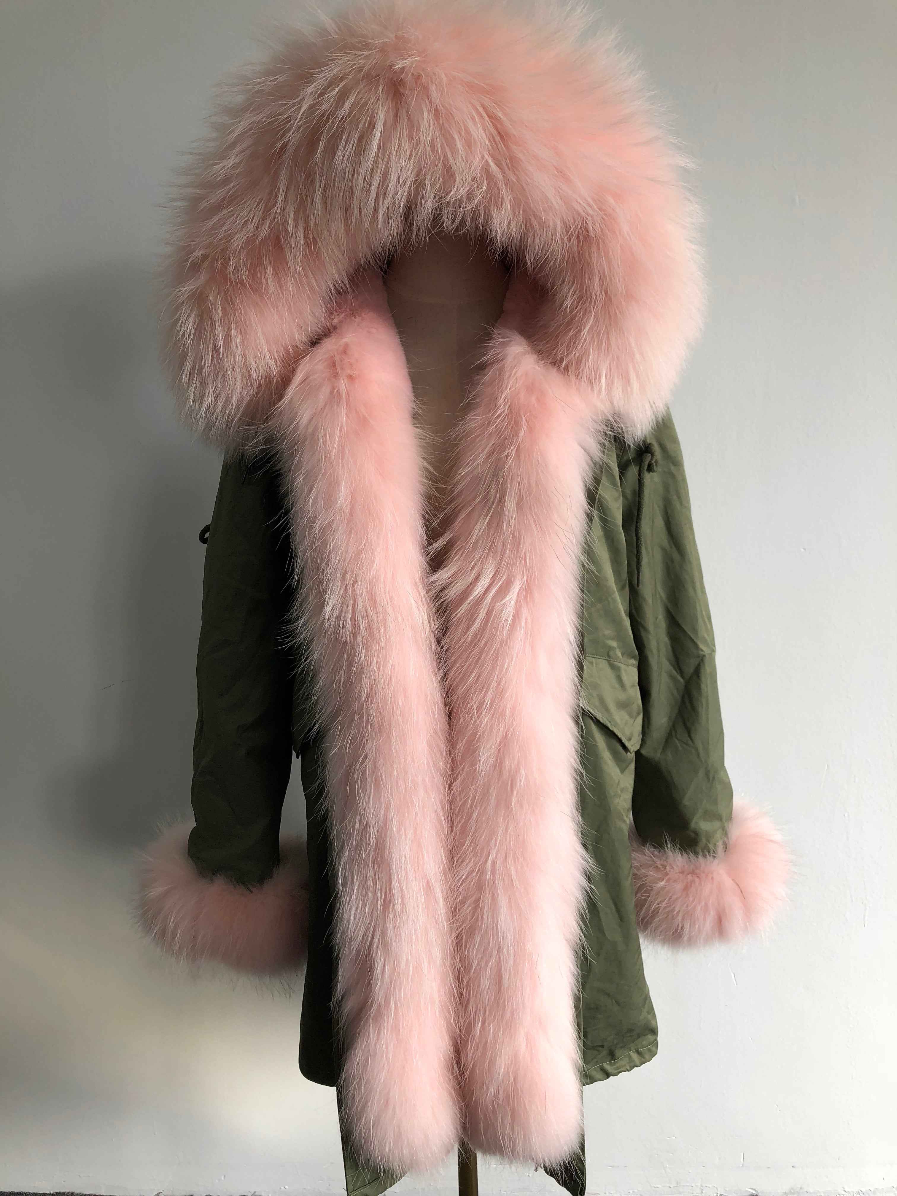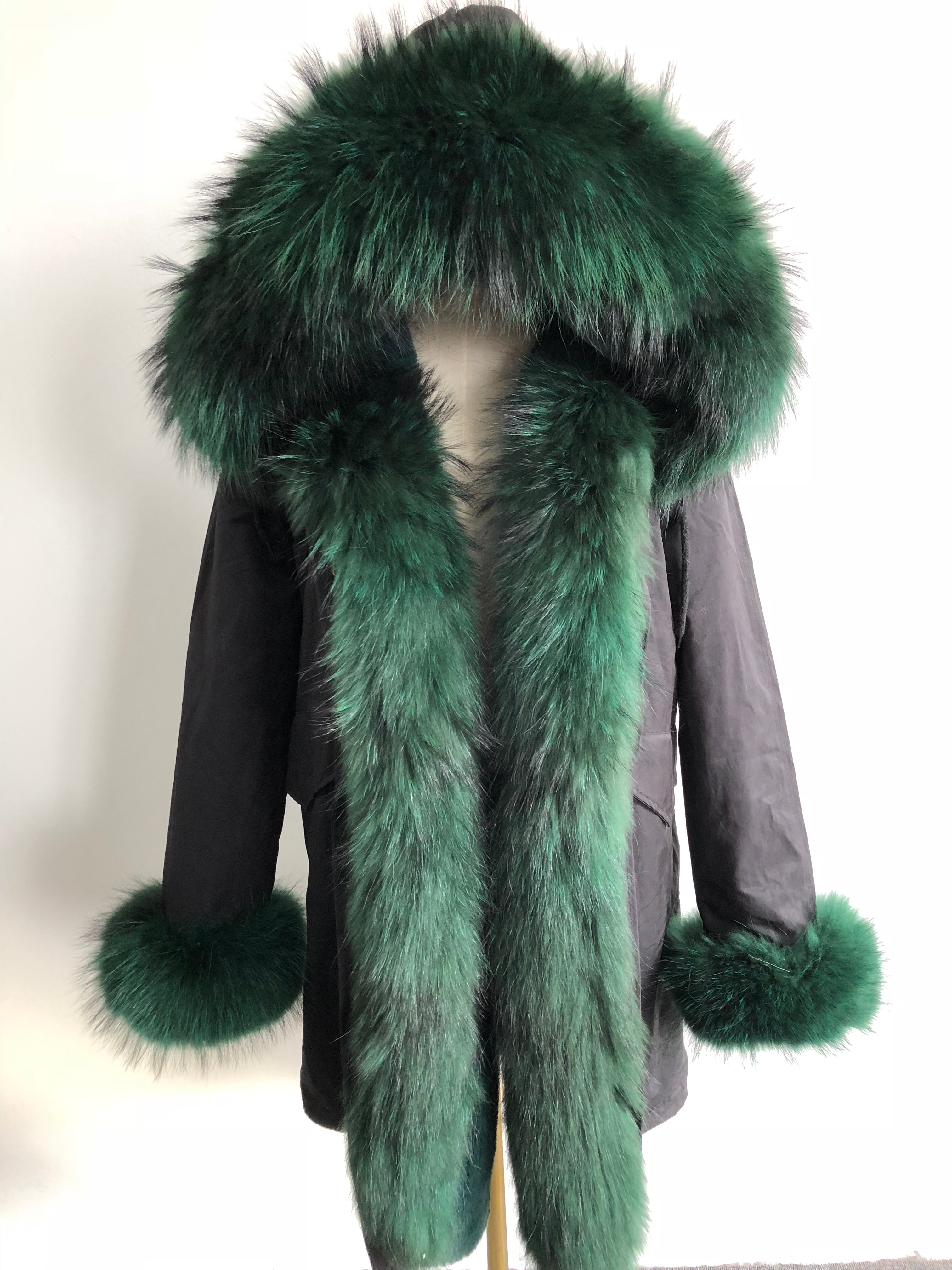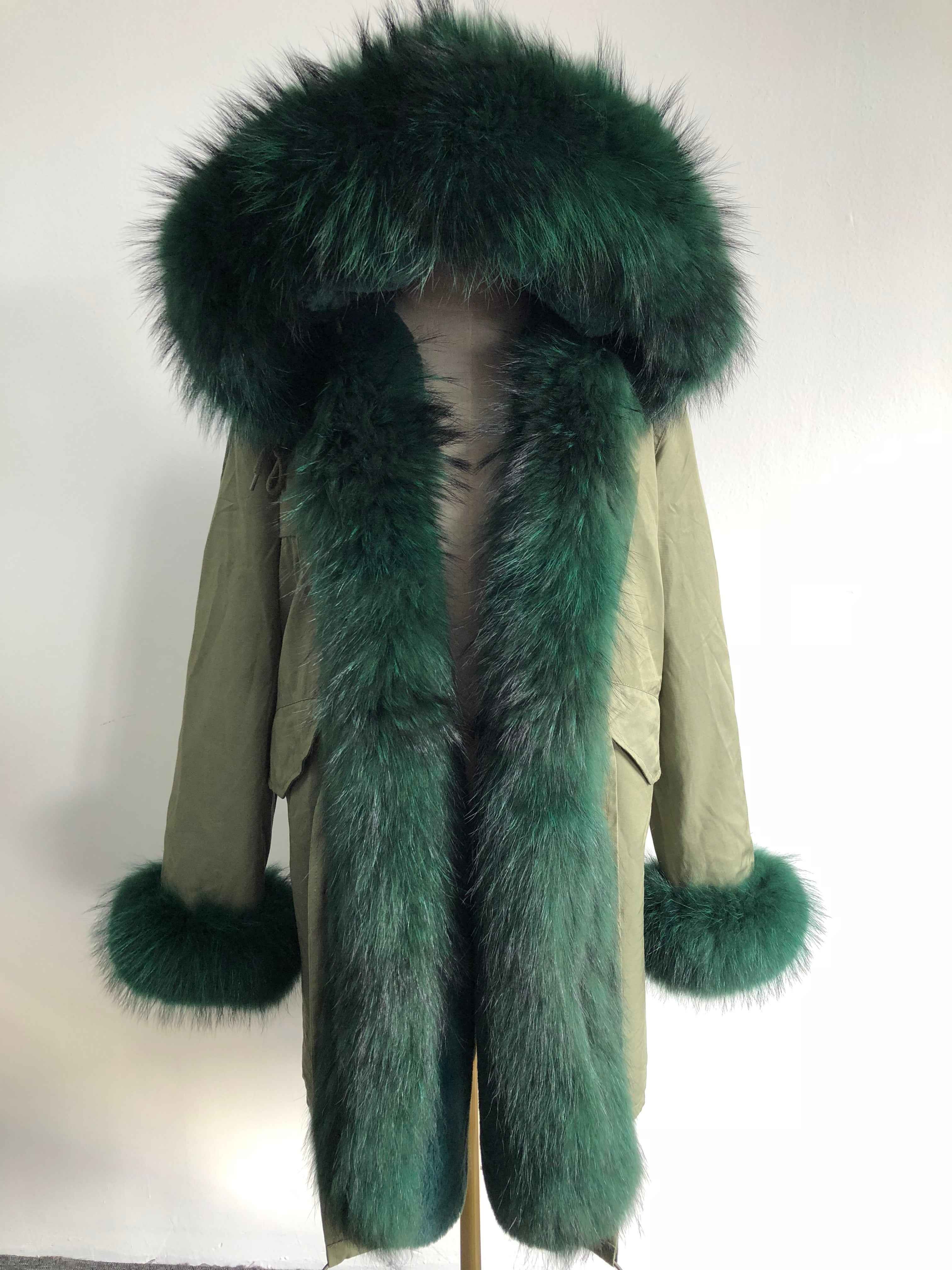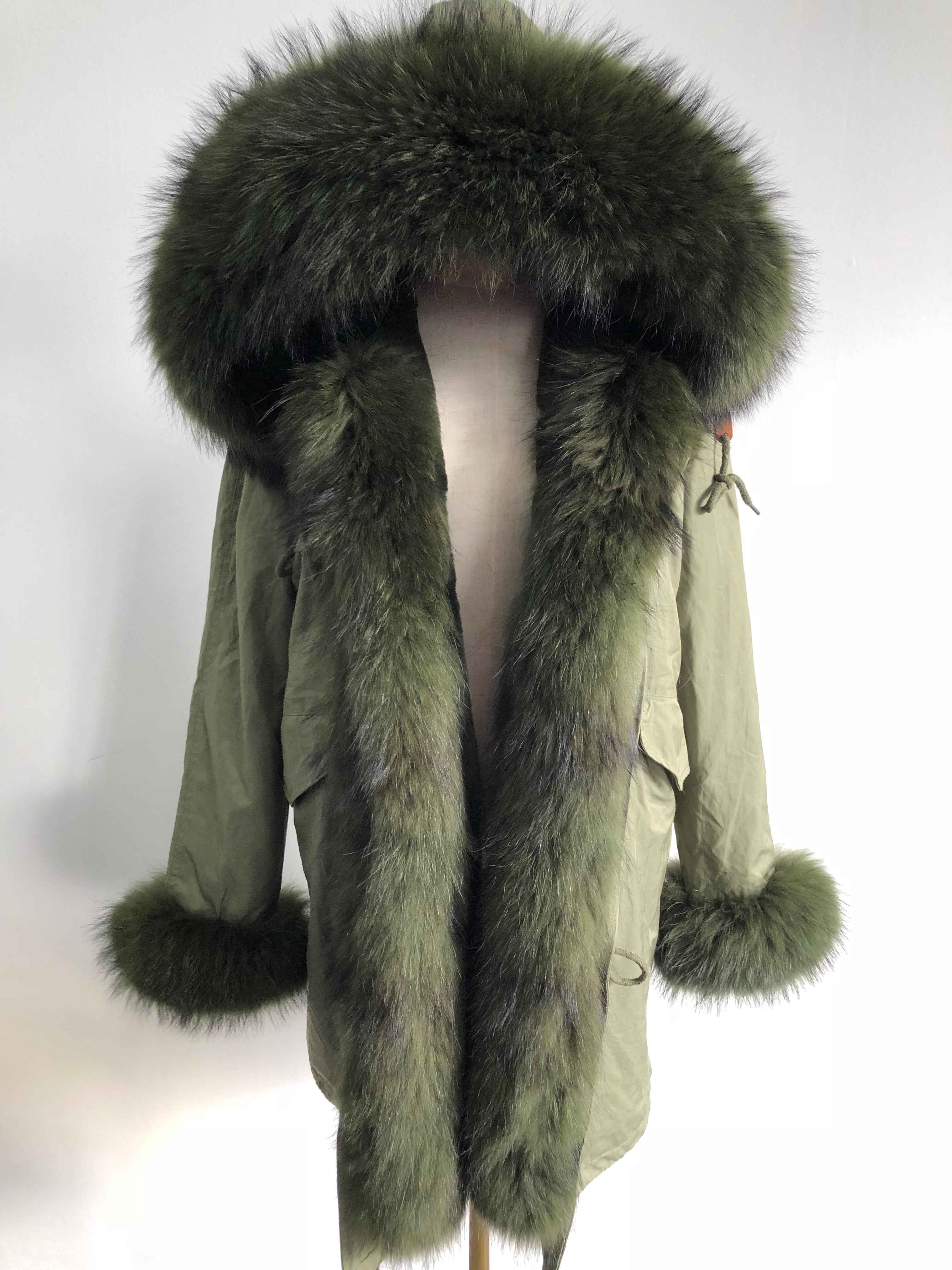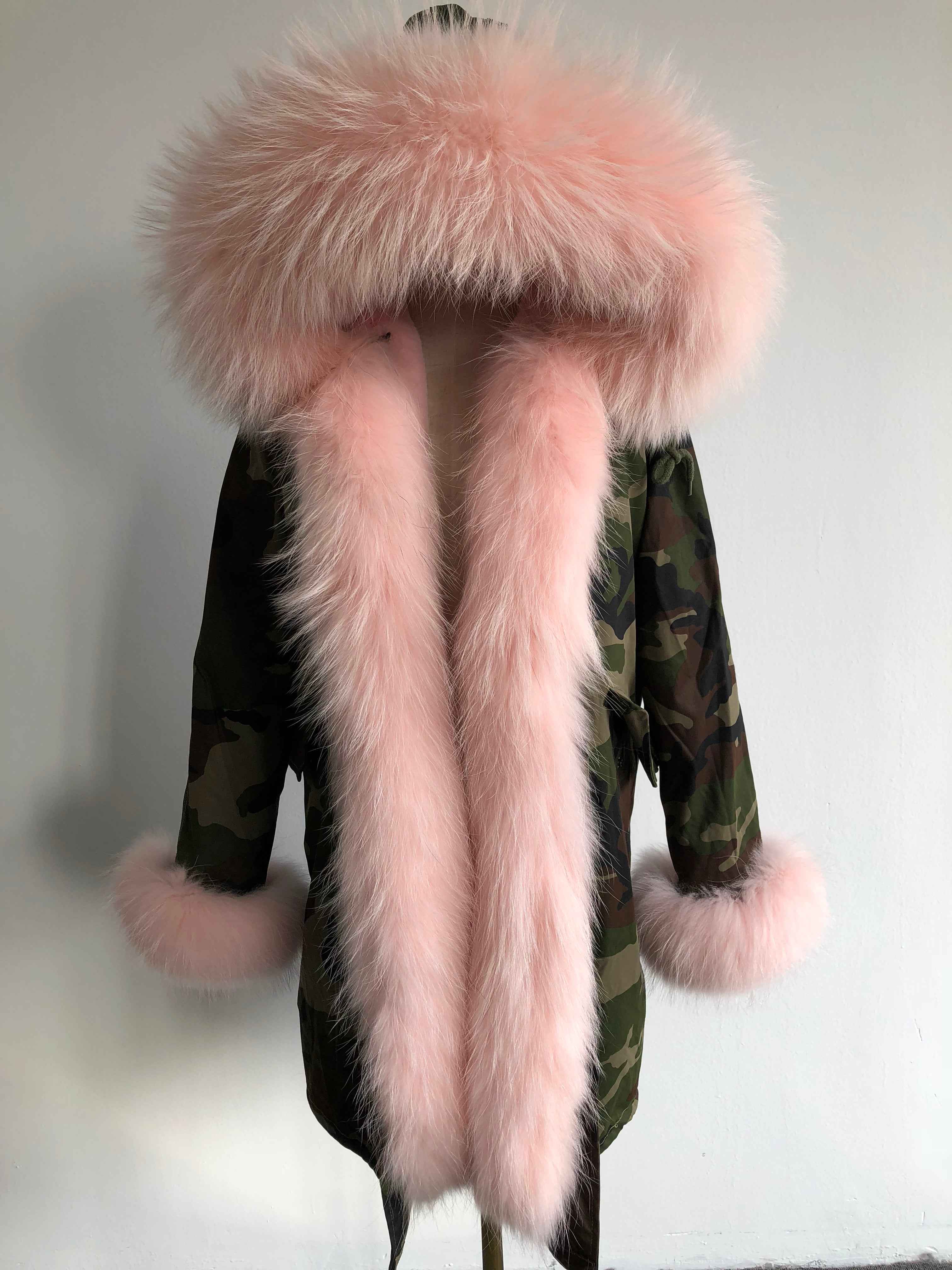 Long Camouflage Parka with Raccoon Fur Trim – Hooded Winter Coat for Women, Full-Length Raccoon Fur Collar & Cuffs, Warm and Luxurious Outerwear