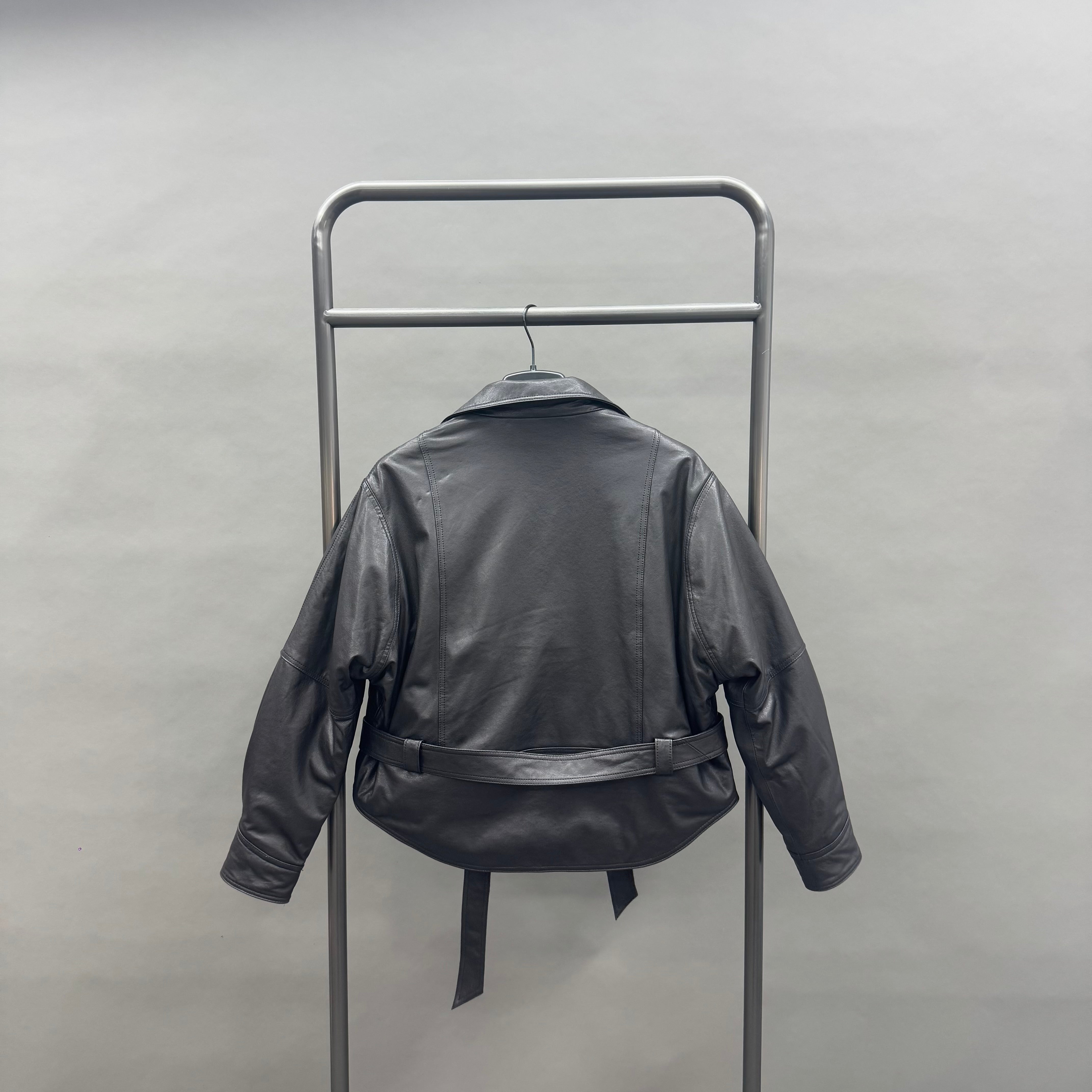 Women’s Black Belted Leather Biker Jacket – Asymmetrical Lapel Short Coat with Waist Tie for Fashionable Winter Wear