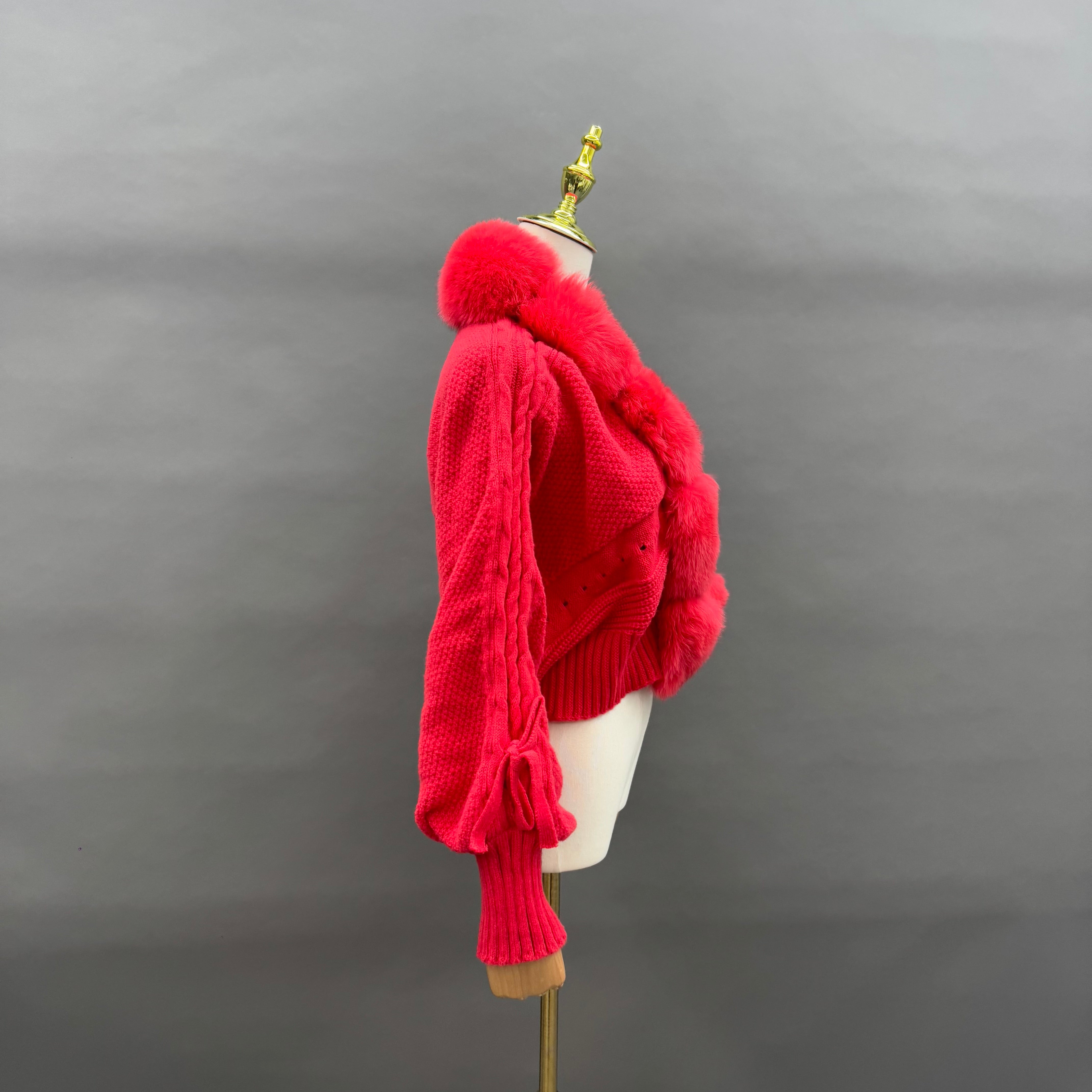 Women’s Black Chunky Knit Jacket with Real Fox Fur Collar – Oversized Cropped Cardigan for Winter Fashion