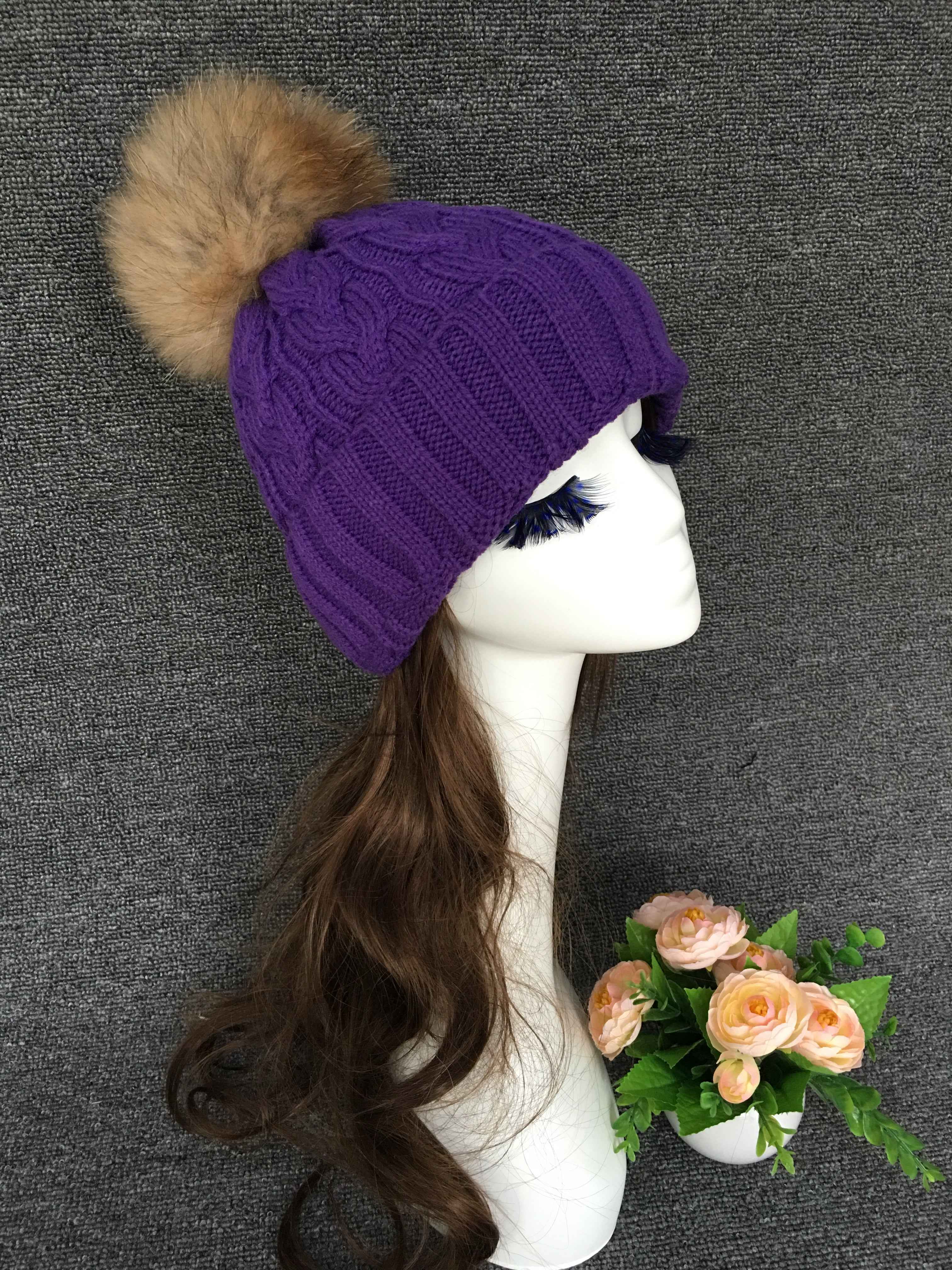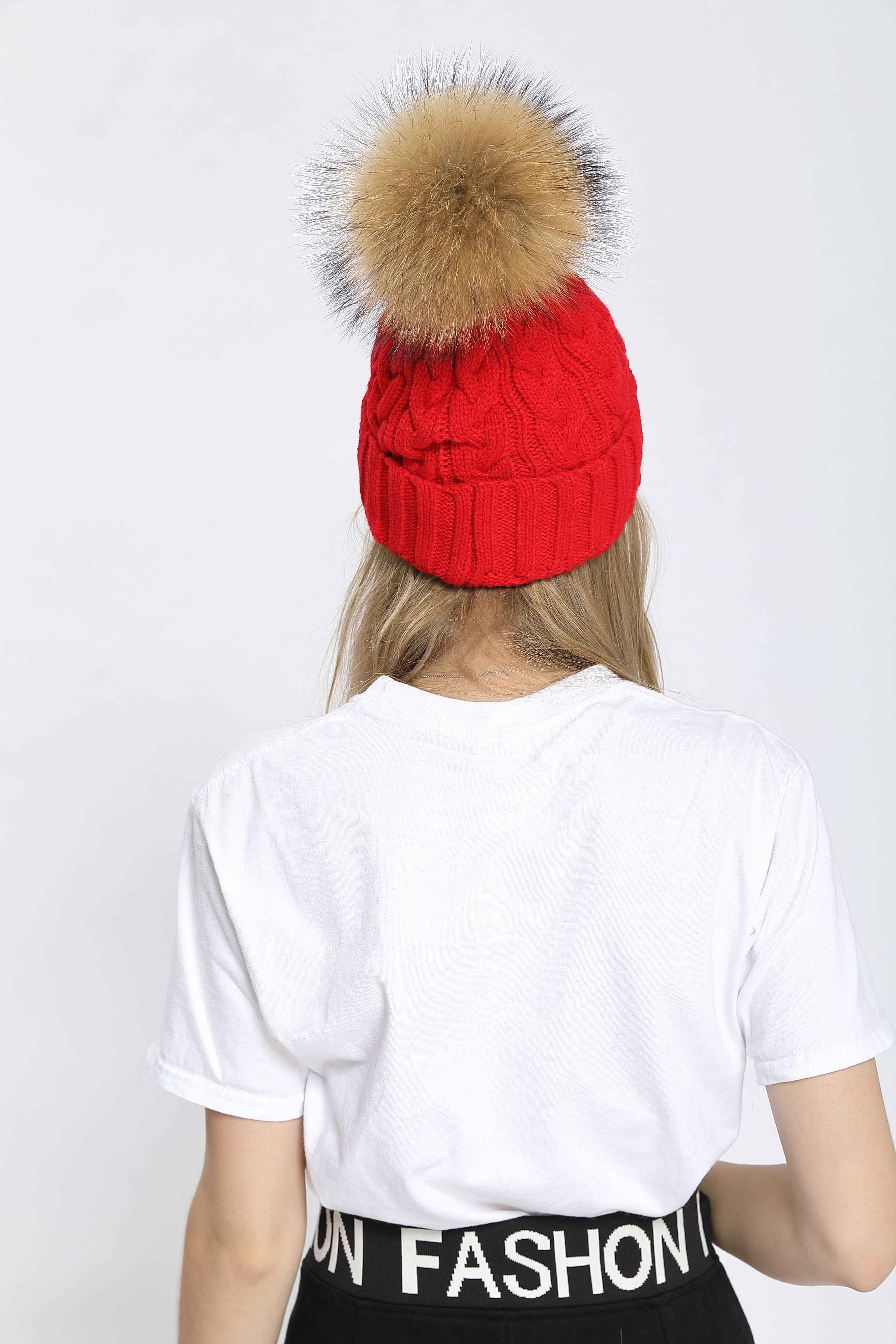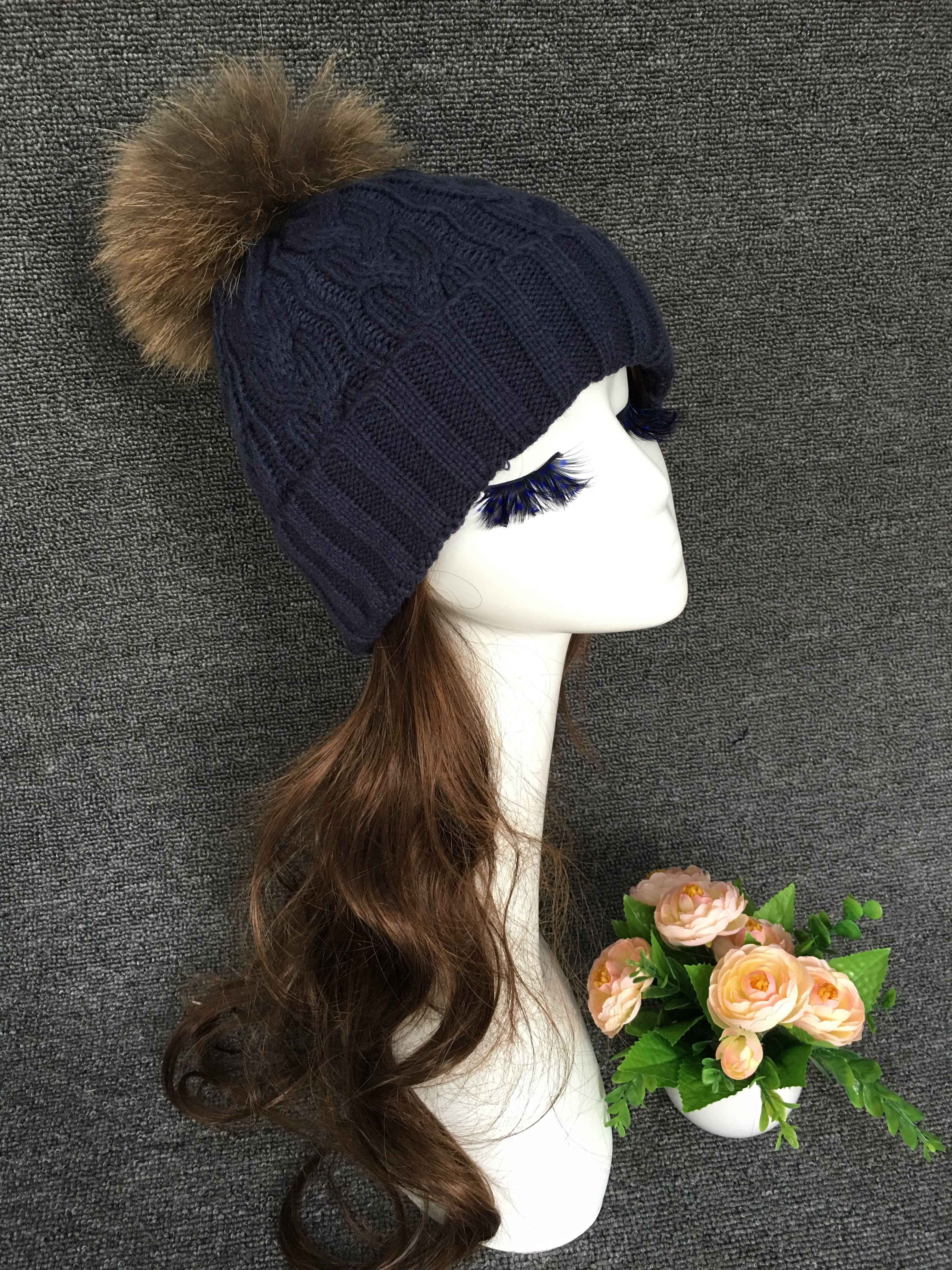 Women's Black Knit Beanie with Raccoon Fur Pom Pom – Winter Hat for Cold Weather, Warm and Stylish Snow Cap