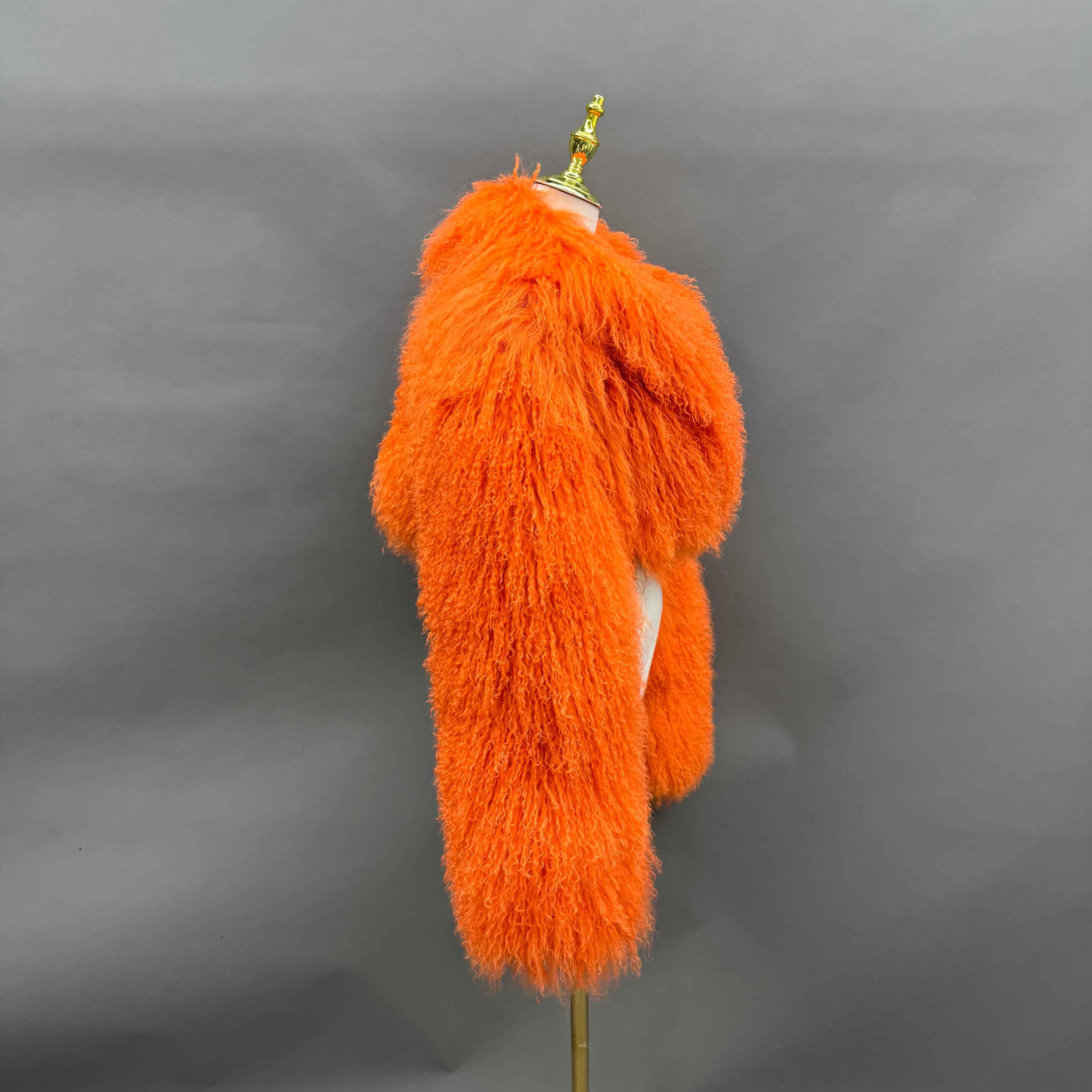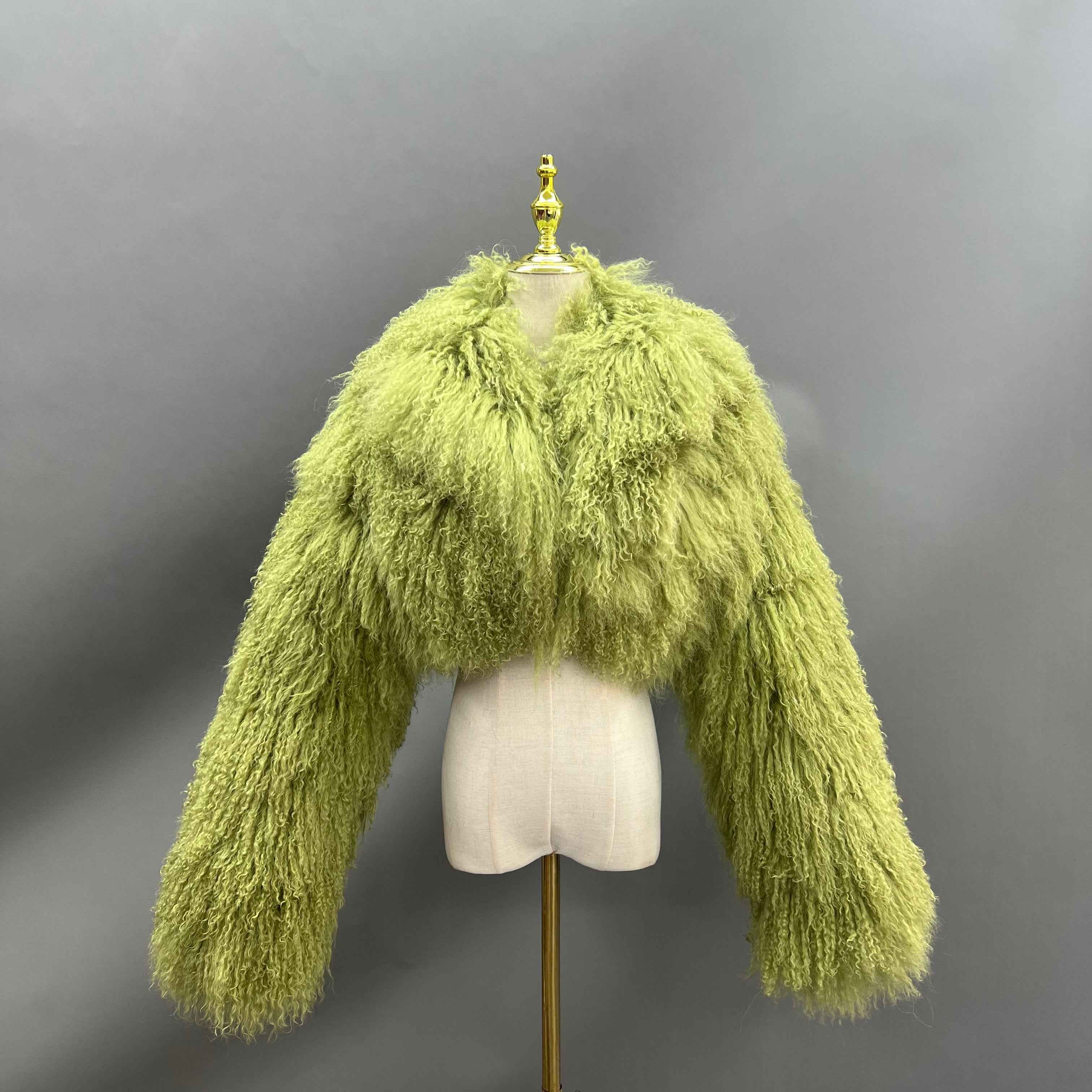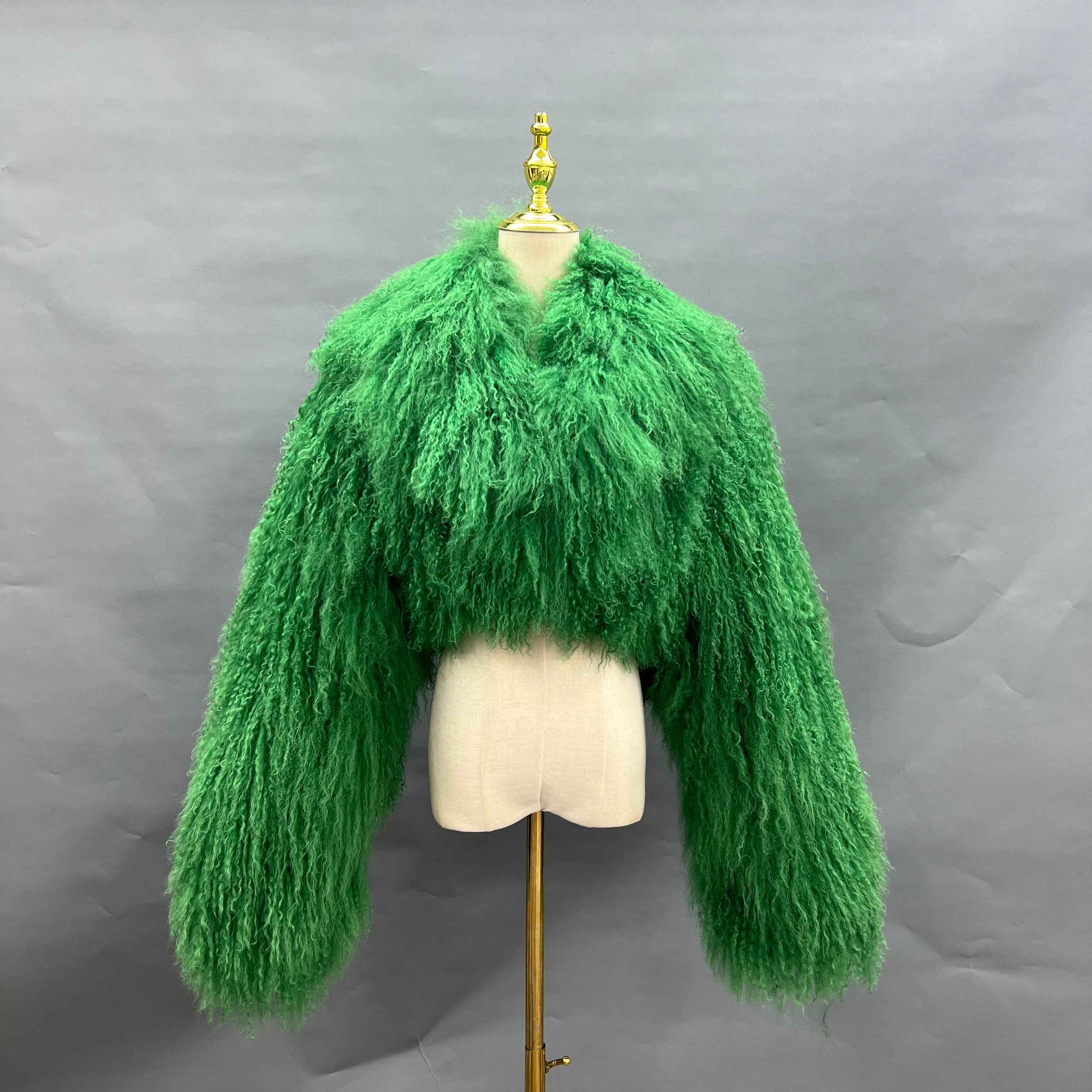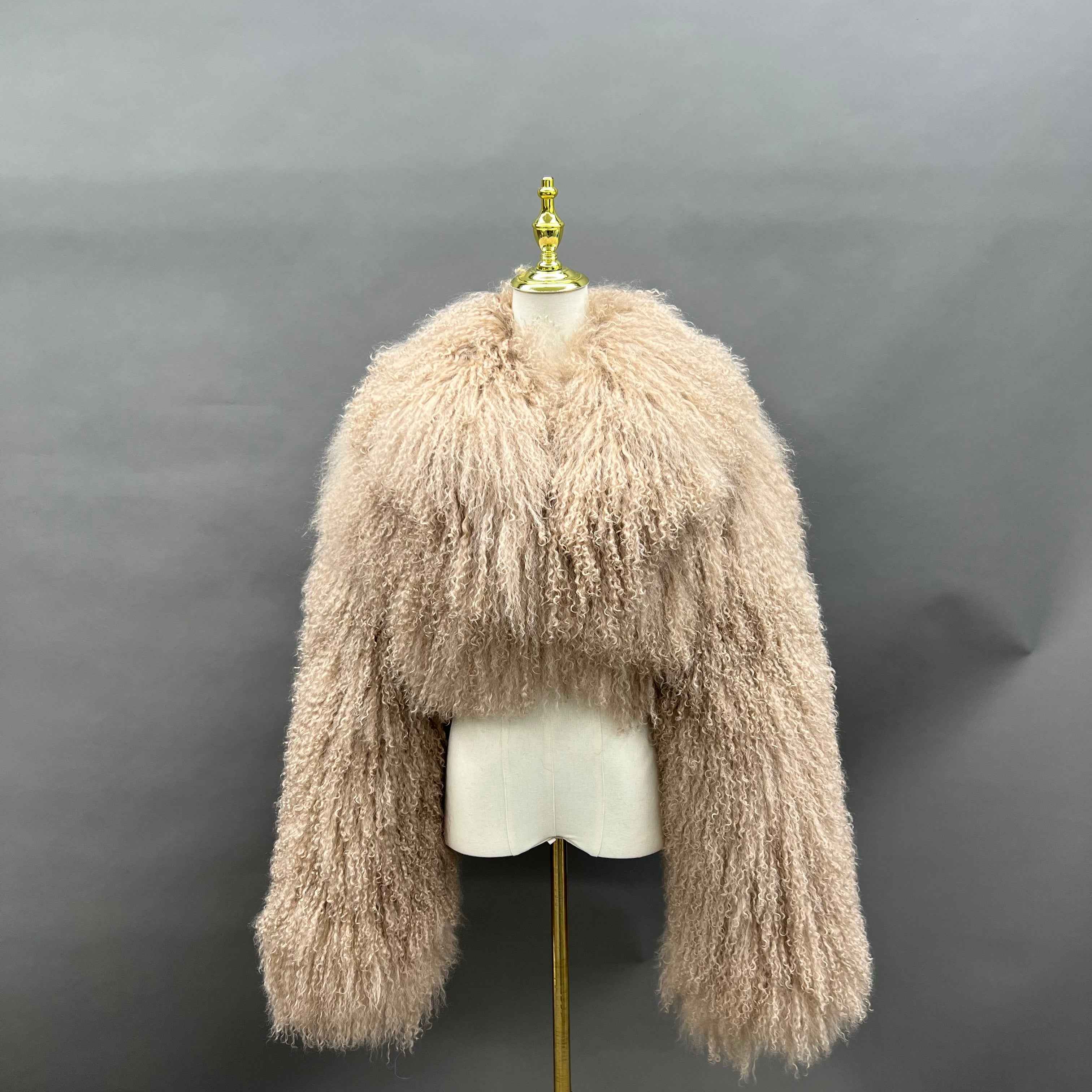 Women's Burgundy Mongolian Lamb Fur Jacket – Notch Lapel, Crop Top, Stylish Winter Outerwear for Women