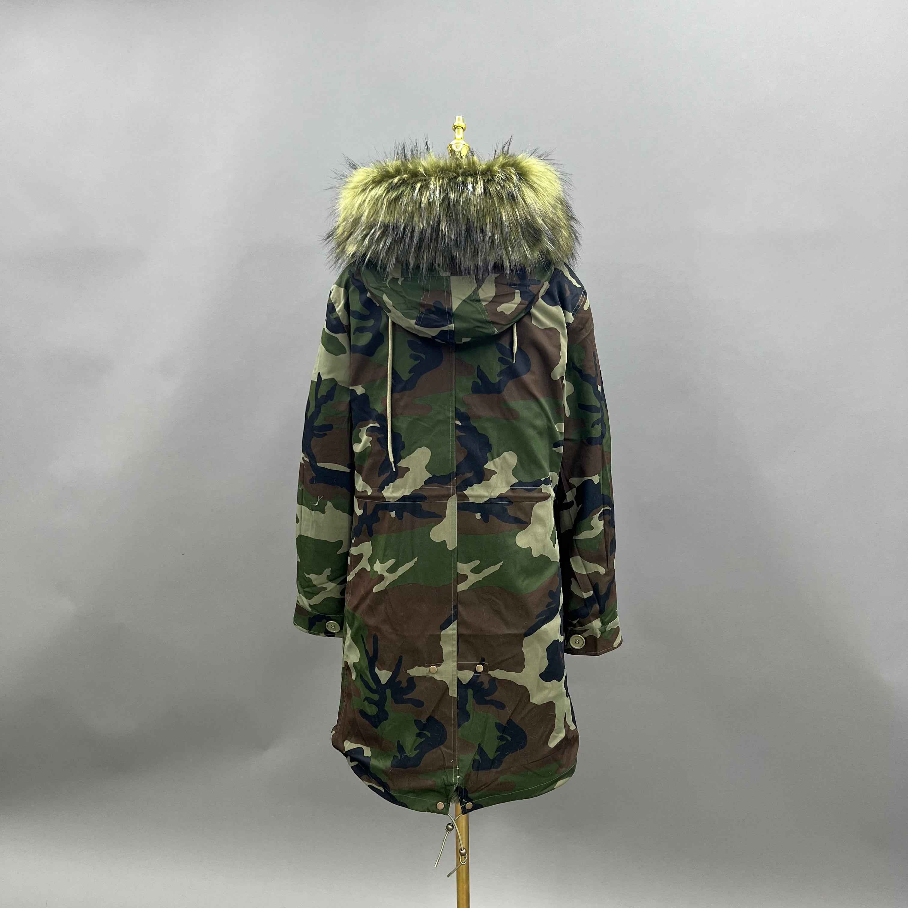 Women's Camouflage Faux Raccoon Fur Parka – Winter Jacket with Fake Fur Hood & Cuffs, Warm Outdoor Coat for Cold Weather