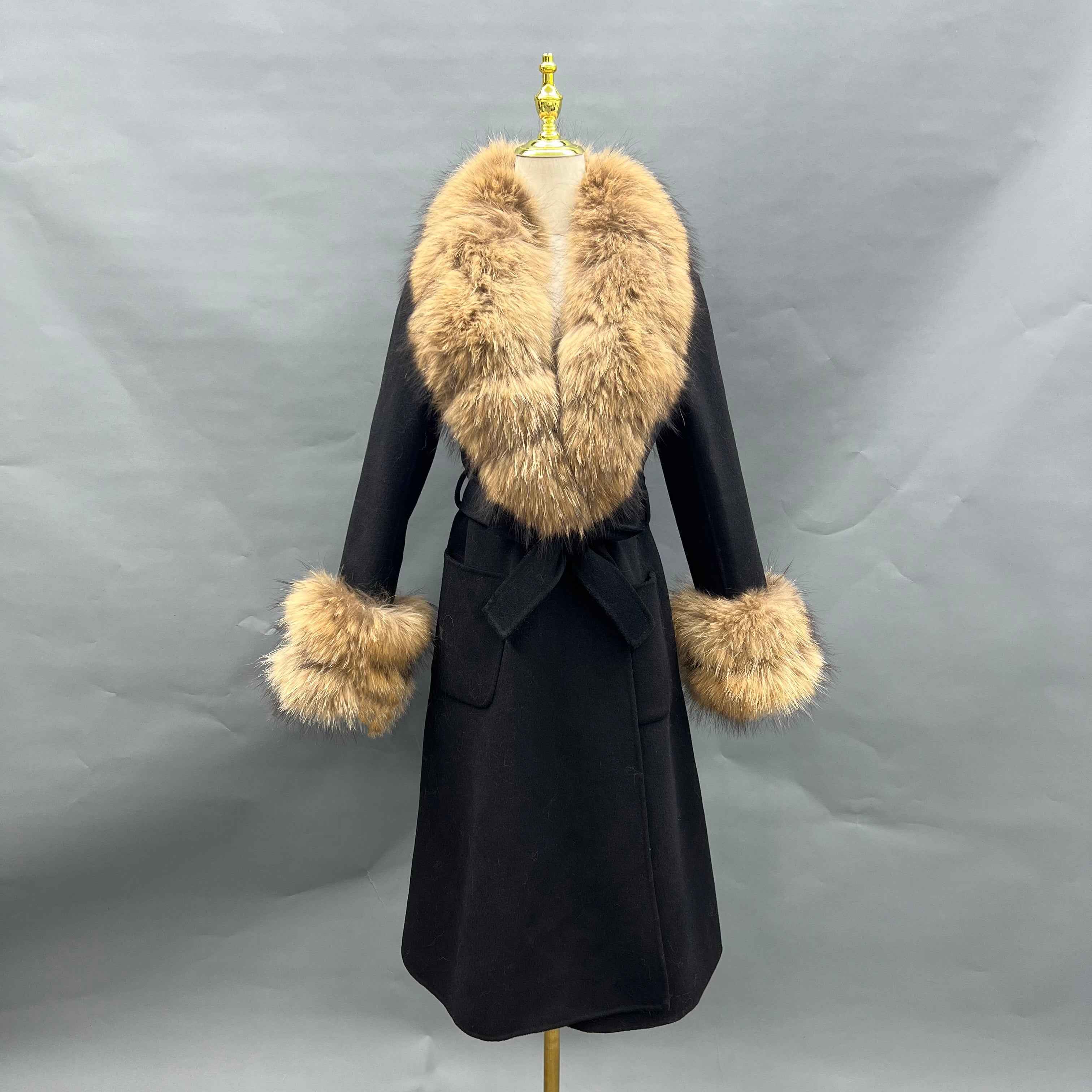 Women's Double-Faced Wool Coat with Real Fox Fur Collar – Long Ivory Trench Coat, Elegant Winter Outerwear for Women