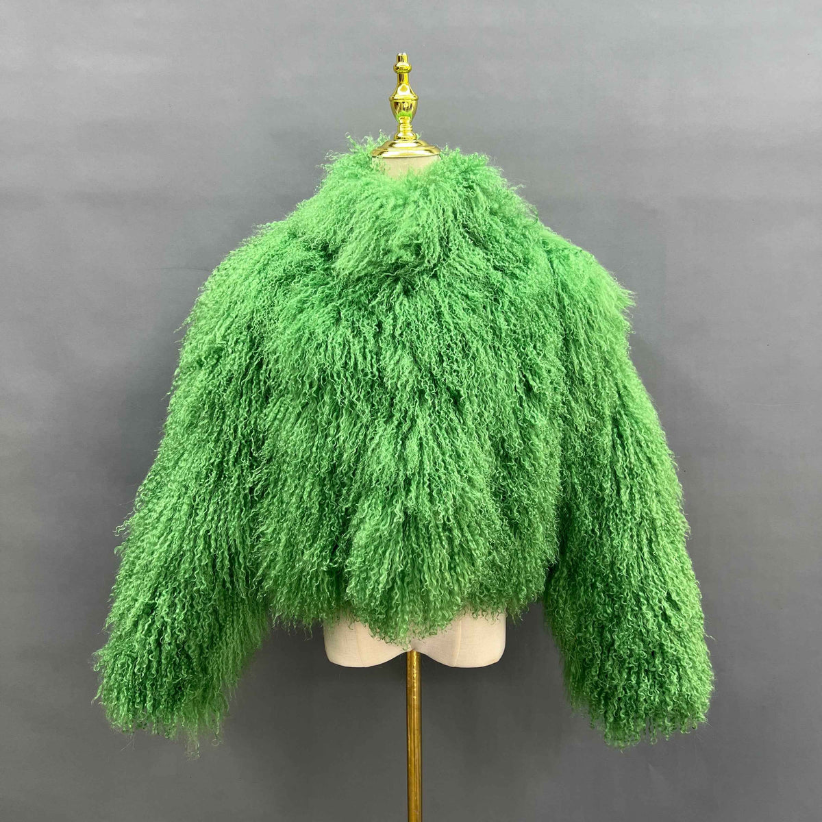 Women's Stand Collar Emerald Green Mongolian Lamb Fur Jacket – Short, Curly Hair, Stylish Winter Outerwear for Women