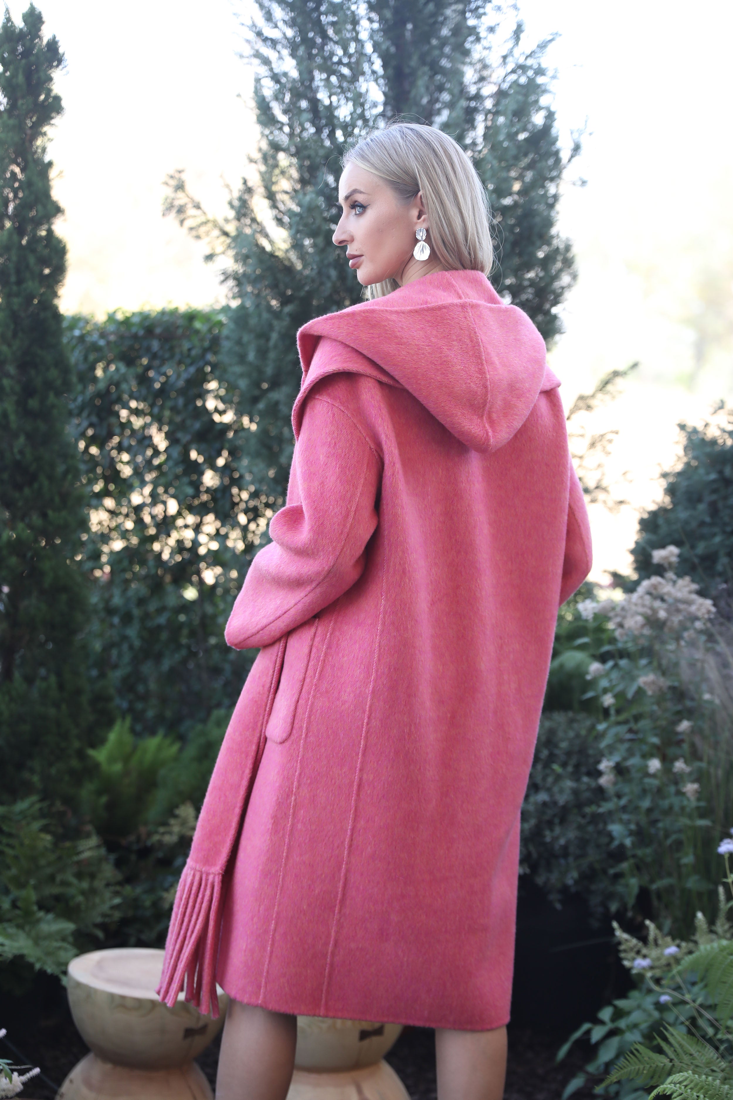 Women’s Pink Double-Faced Wool Coat with Hood and Scarf Collar – Long Winter Jacket with Fringe Detail for Fashion Statement