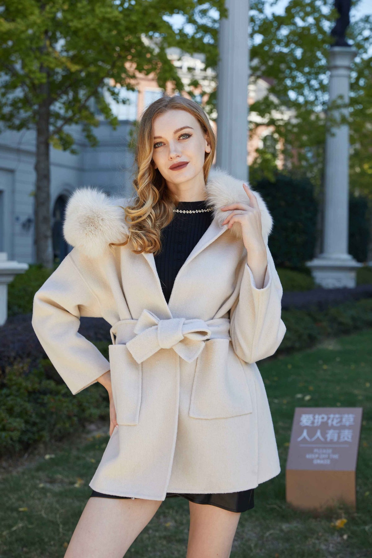 Double - Faced Wool Coat with Fox Fur Hood and Tie Waist