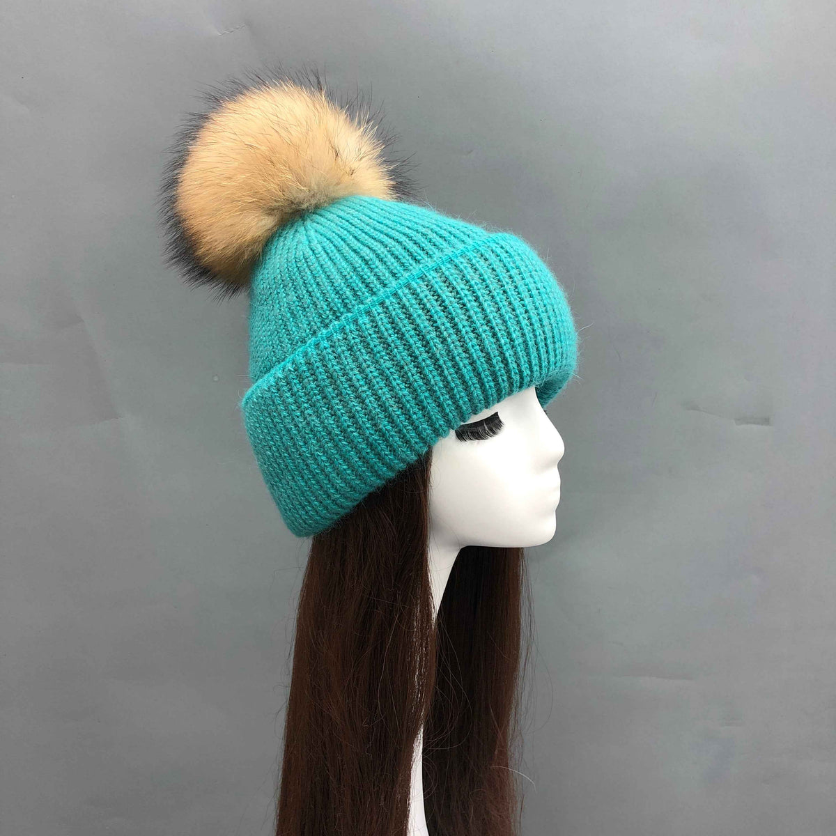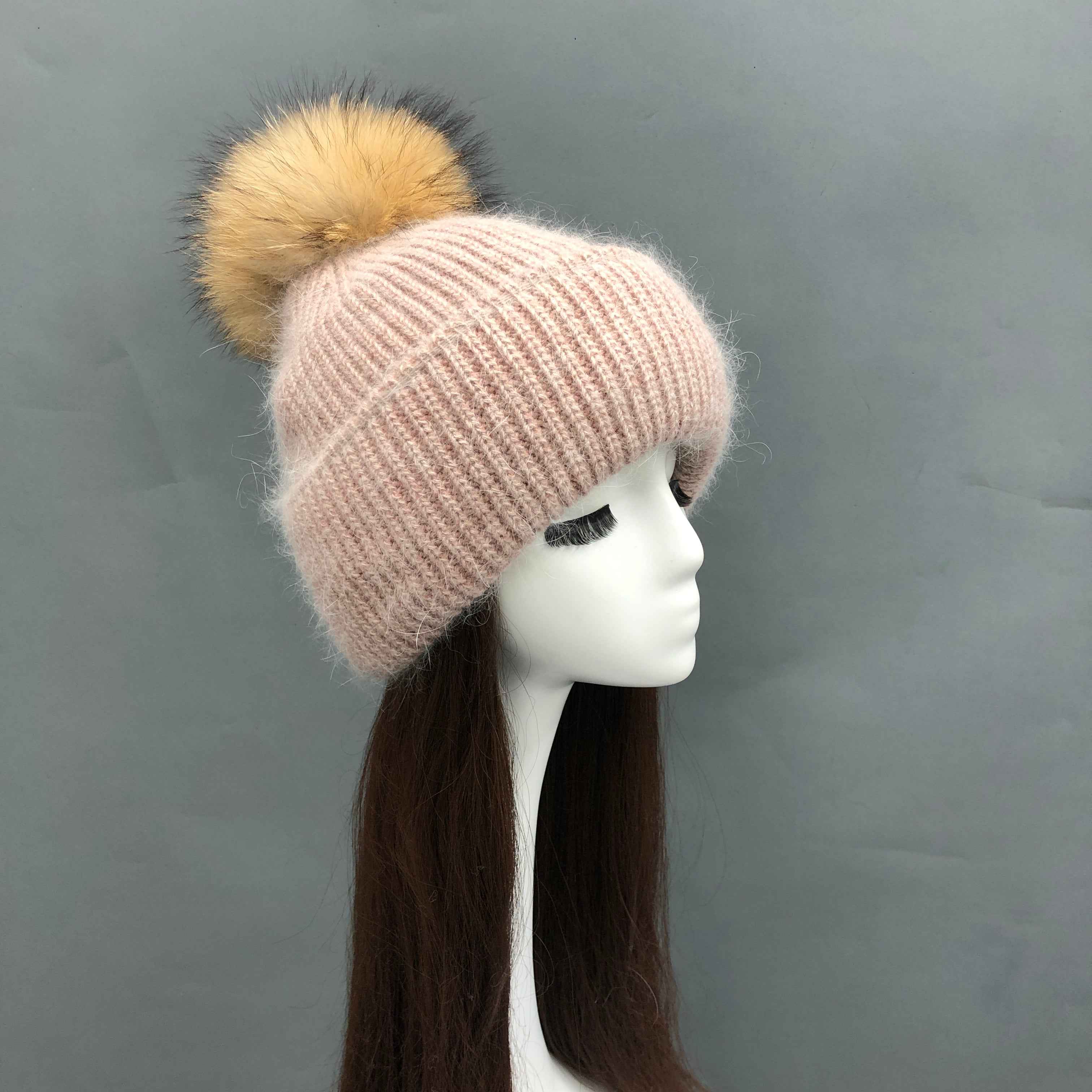 Wholesale Fleece-Lined Rabbit Fur Knit Beanie – Two-Fold Cuff with Raccoon Fur Pompom, Warm Winter Hat for Women, Premium Quality in Bulk