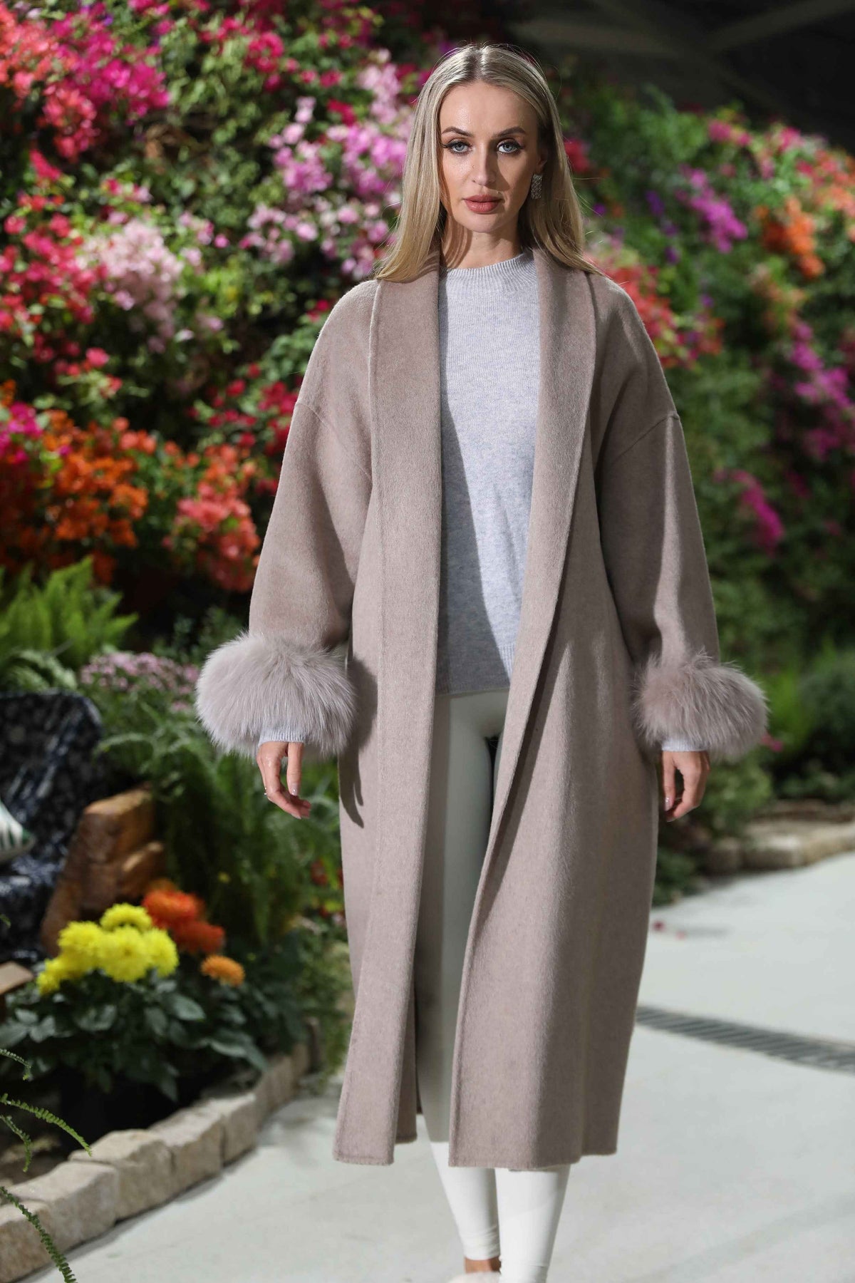 Women’s Beige Double-Faced Wool Wrap Coat with Fox Fur Cuffs – Drop Shoulder Belted Long Winter Jacket for Elegant Fashion