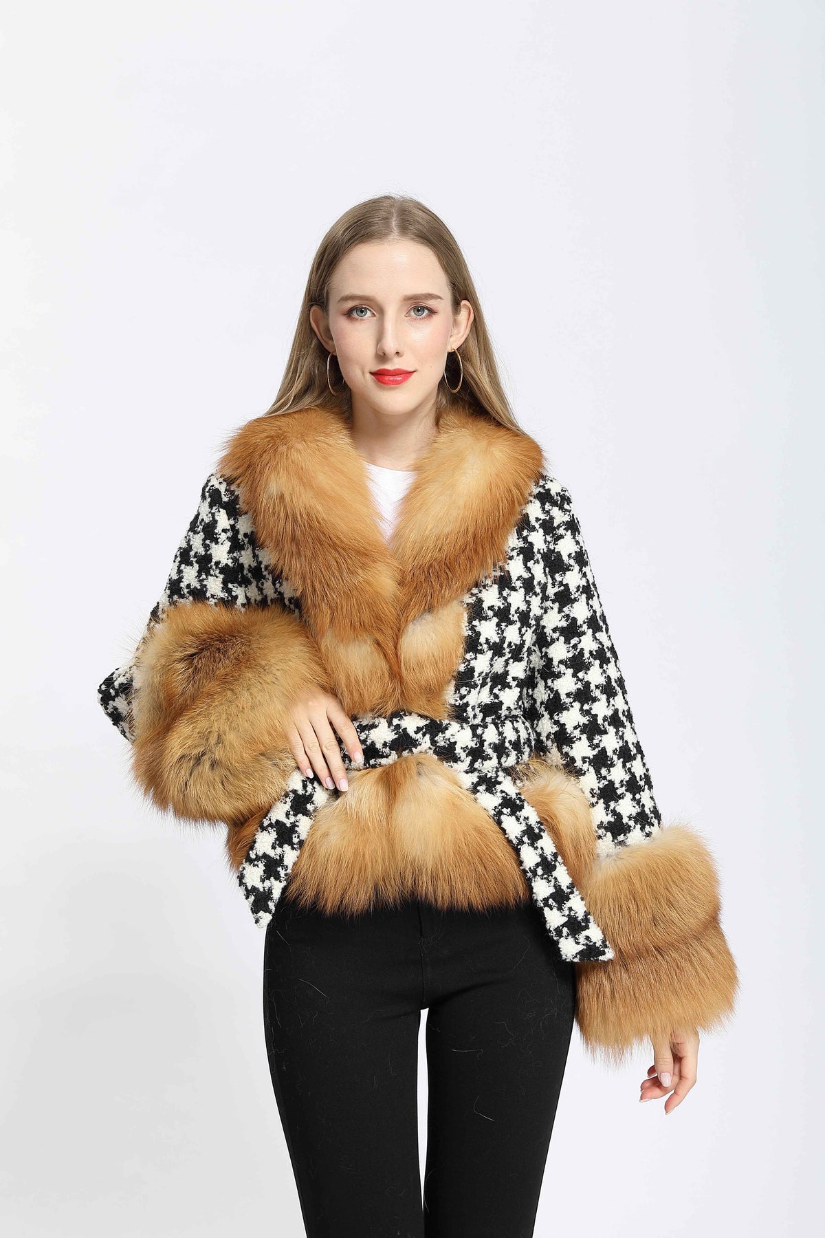 Women's Black White Houndstooth Wool Belted Coat with Fox Fur Collar and Cuffs Trim, Elegant Winter Jacket for Casual Outfits