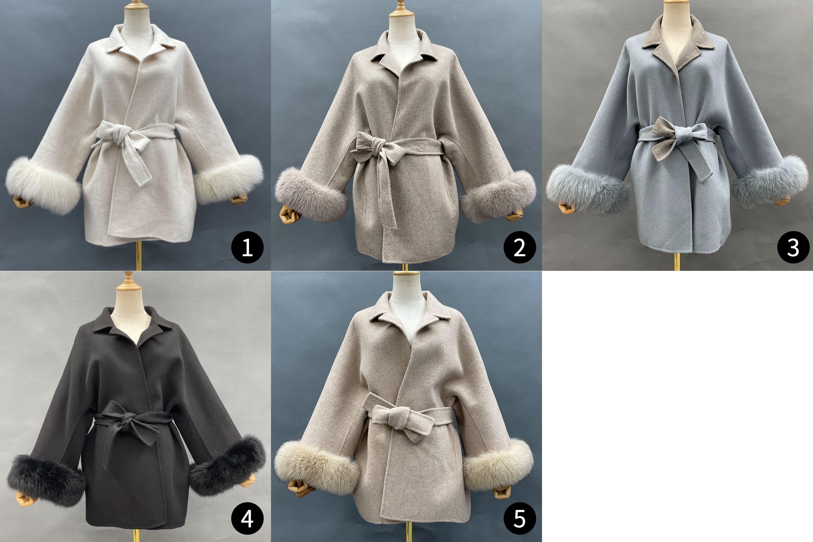 Elegant Beige Double-Faced Wool Coat with Real Fox Fur Cuffs – Belted Waist, Luxurious Winter Fashion for Women
