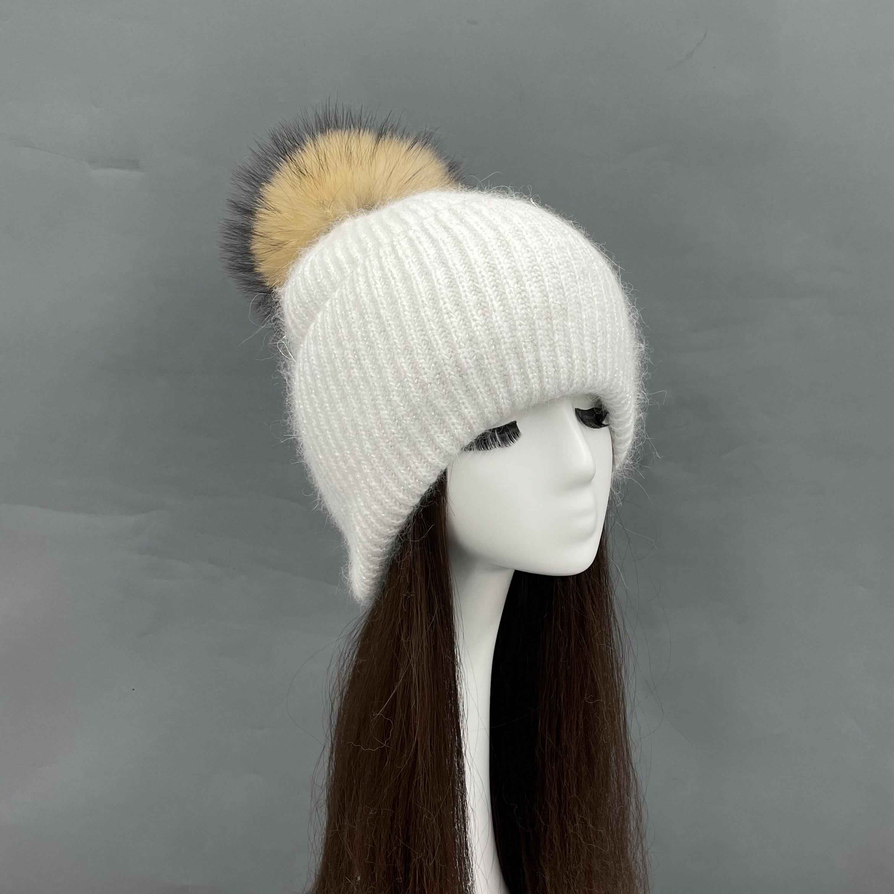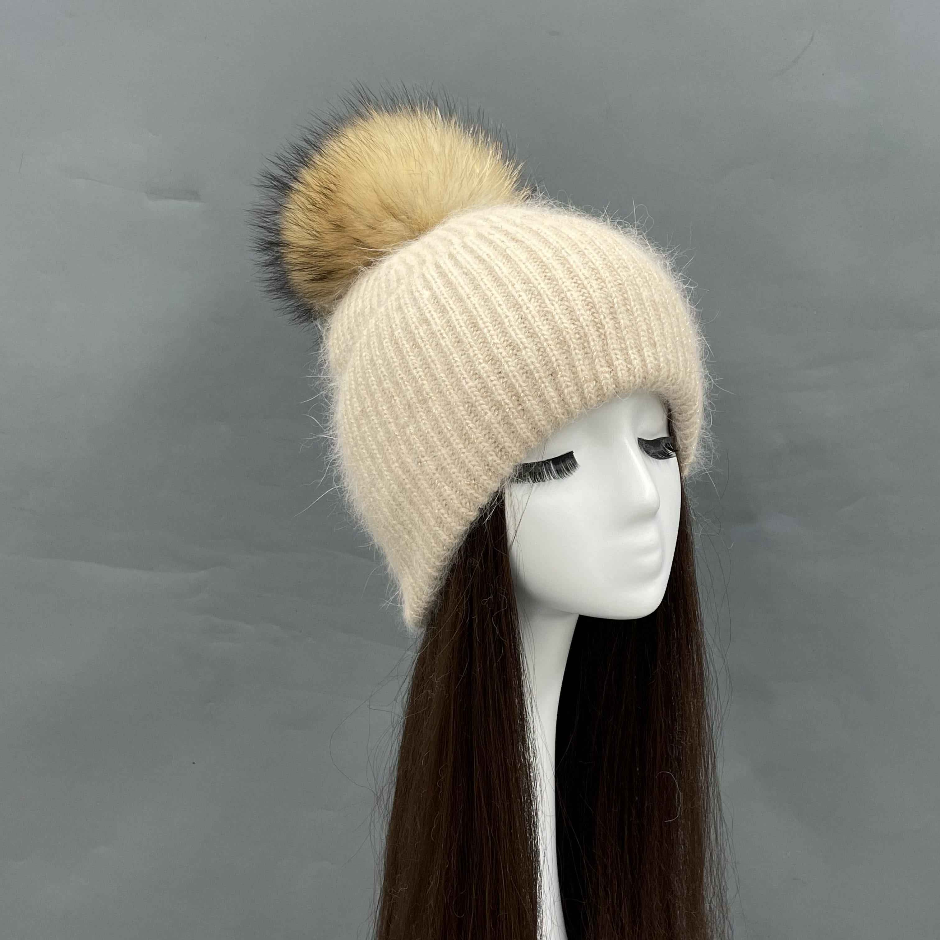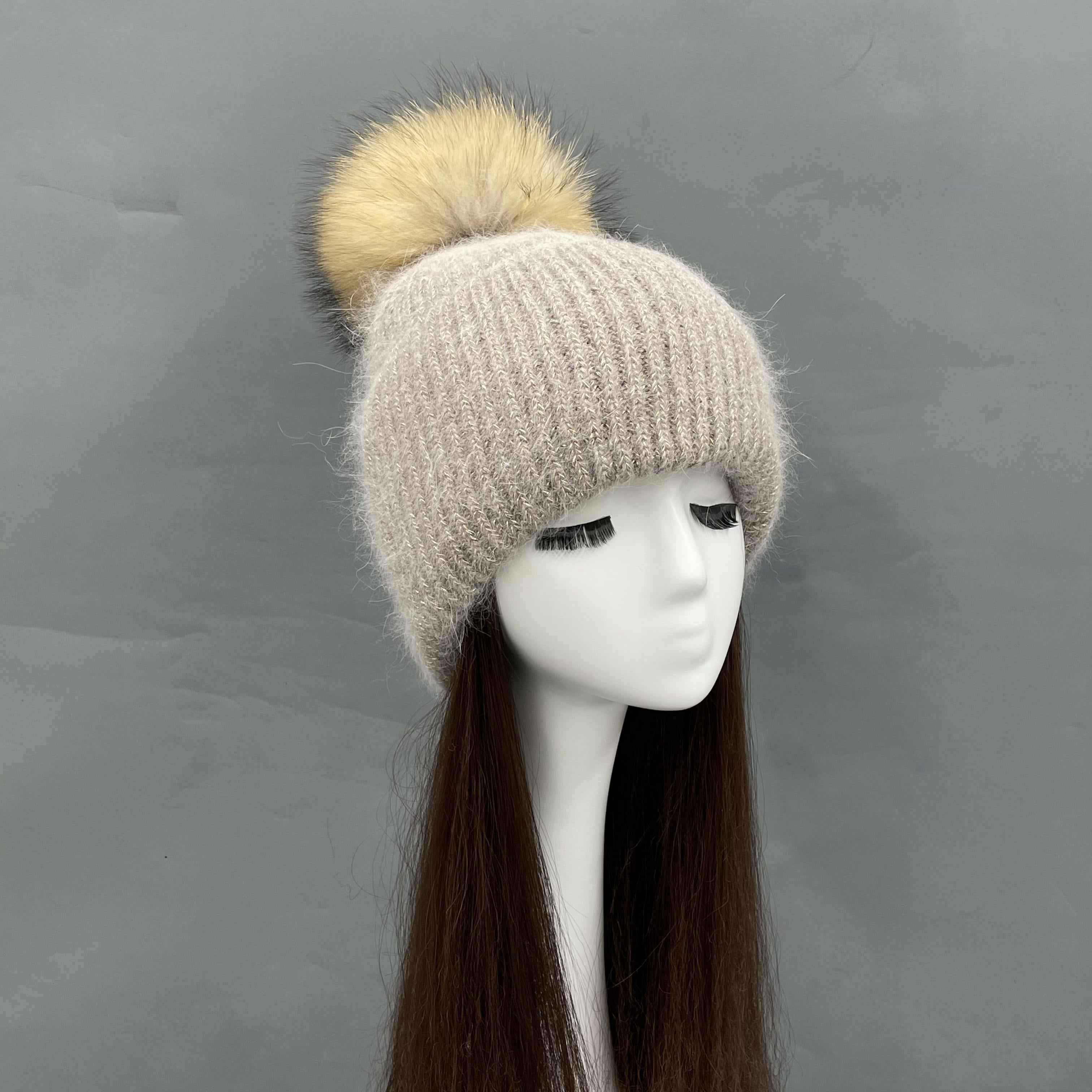 Wholesale Shiny Rabbit Fur Knit Beanie – Raccoon Fur Pompom Top, Winter Hat for Women, Premium Warmth & Fashion in Bulk