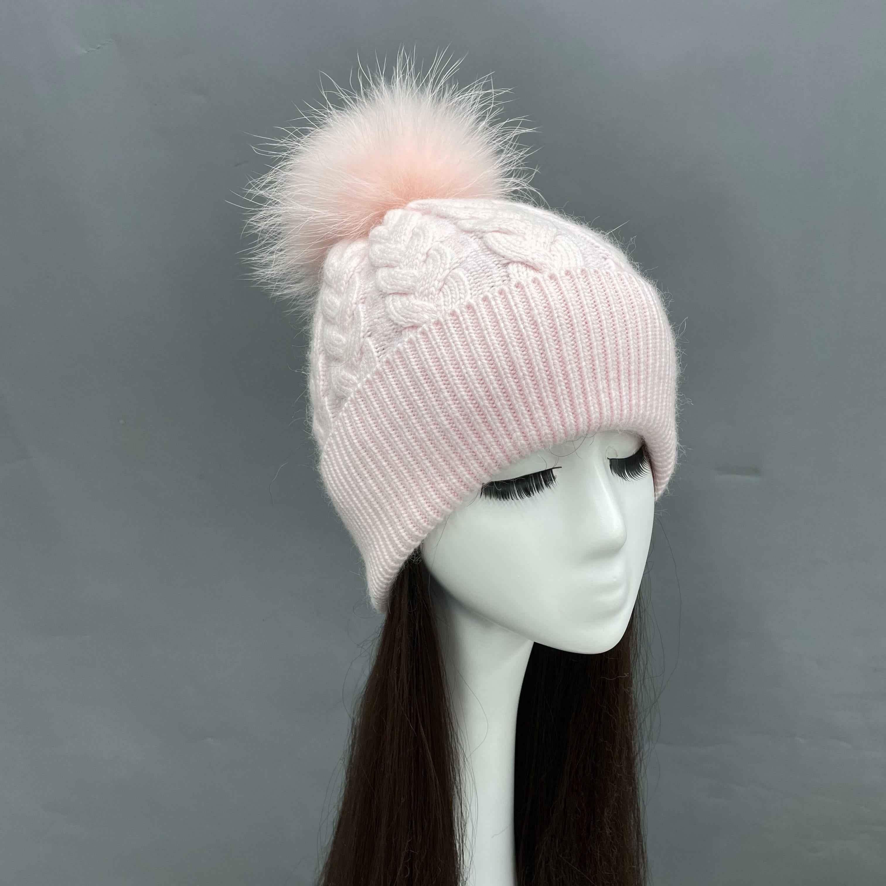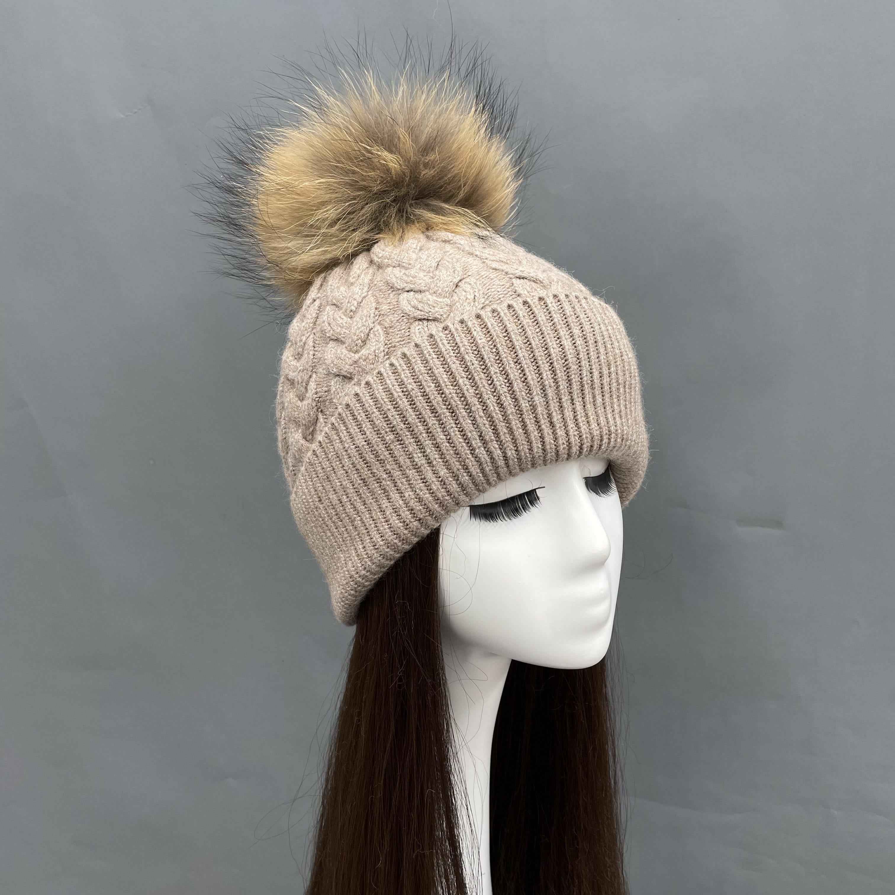 Women's Burgundy Cable Knit Beanie with Matching Raccoon Dog Fur Pom-Pom – Soft Rabbit Blend, Stylish Winter Hat for Holiday & Party Wear